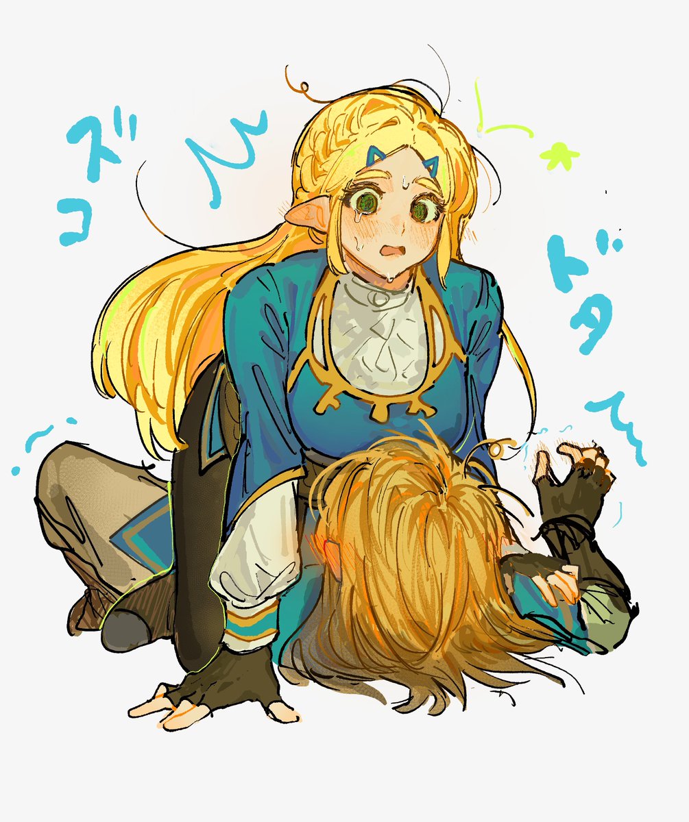 1boy 1girl black_gloves blonde_hair blue_shirt blush couple ear_blush fingerless_gloves girl_on_top gloves green_eyes hetero highres link long_hair lying nintendo open_mouth pointy_ears princess_zelda shanodesu shirt short_hair simple_background sweat the_legend_of_zelda white_background