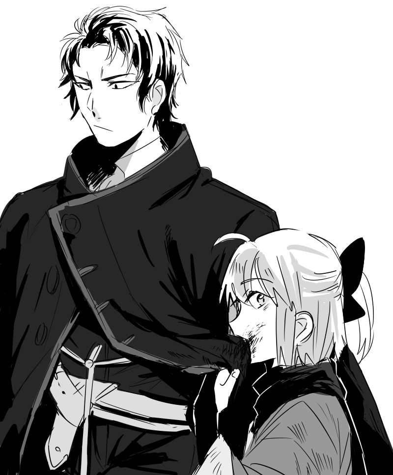 1boy 1girl :/ ahoge blood blood_on_face bow bridal_gauntlets cape closed_mouth fate_(series) greyscale hair_bow hijikata_toshizou_(fate) koha-ace looking_at_viewer looking_to_the_side monochrome noz_2to okita_souji_(fate) okita_souji_(koha-ace) okita_souji_(third_ascension)_(fate) sanpaku scarf short_hair simple_background upper_body wiping_mouth