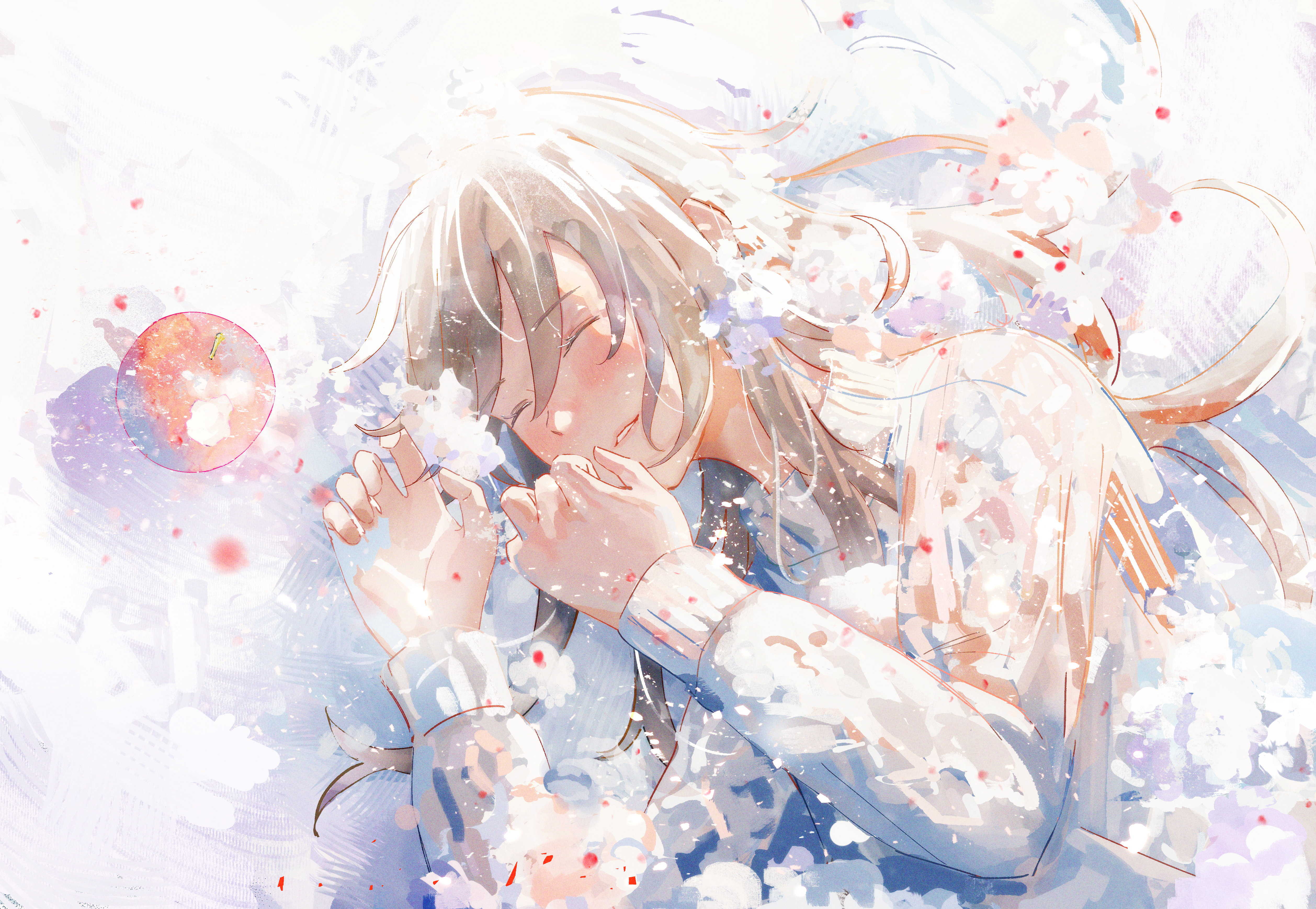 1girl absurdres apple brown_hair closed_eyes food fruit highres long_hair long_sleeves lying on_side original sakura_inu_(itoyatomo) sleeping solo upper_body