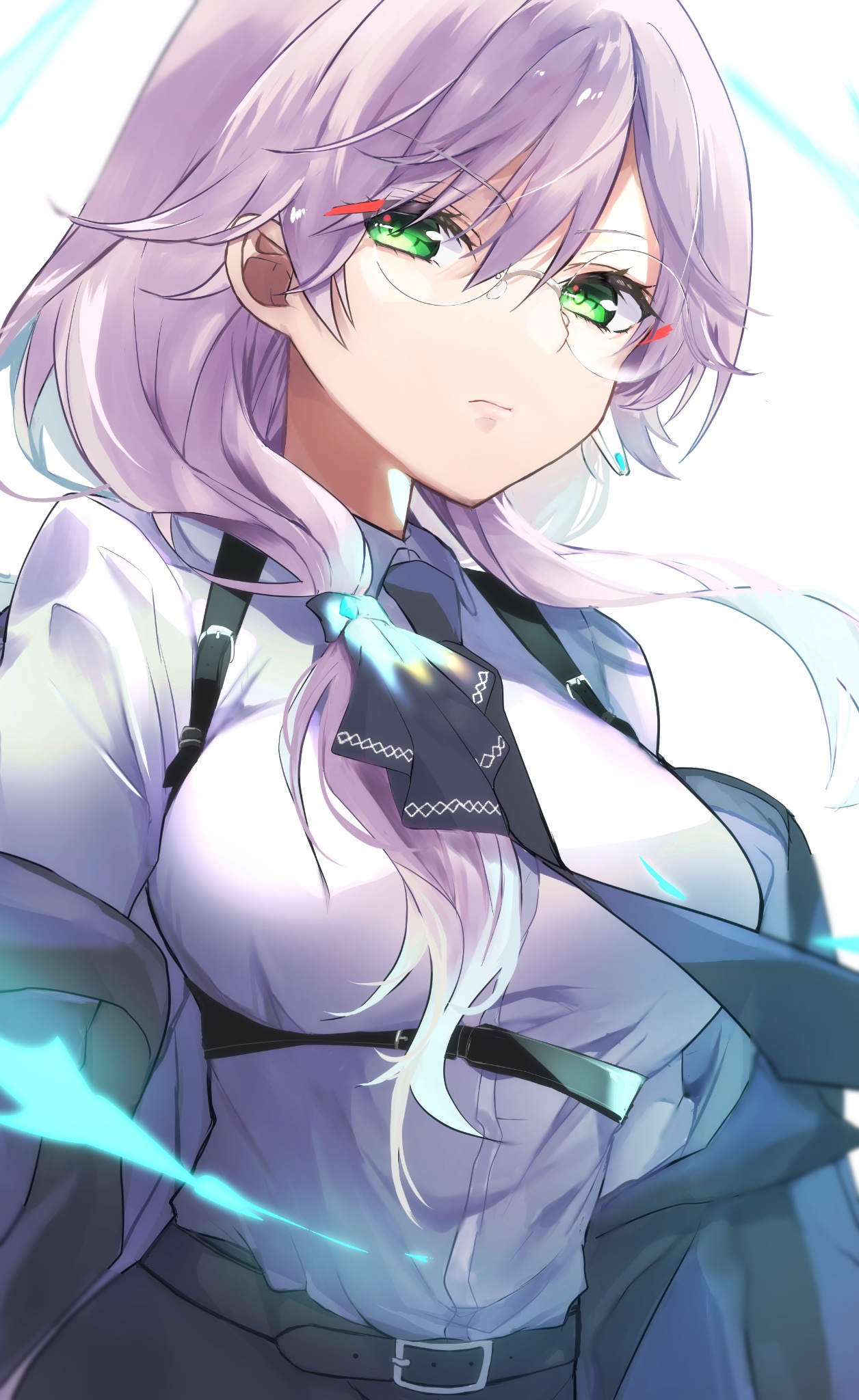 1girl belt black_pants breast_cutouts breasts chest_harness glasses green_eyes grey_hair harness heaven_burns_red highres izumi_yuki jacket k_i49 large_breasts long_hair low-tied_long_hair pants red_eyes round_eyewear shirt solo white_shirt