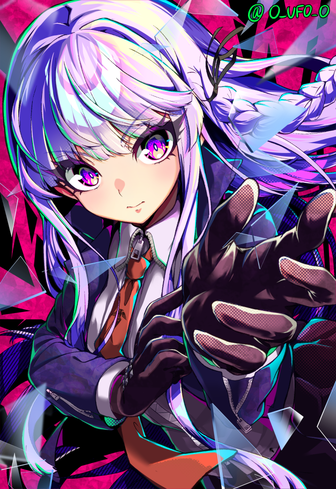 1girl adamusuki adjusting_clothes adjusting_gloves artist_name black_background black_gloves black_ribbon braid brown_necktie collared_shirt commentary_request danganronpa:_trigger_happy_havoc danganronpa_(series) gloves grey_hair hair_ribbon hands_up jacket kirigiri_kyoko long_hair looking_at_viewer multicolored_background necktie open_clothes open_jacket pink_background pink_eyes pink_hair ribbon shirt side_braid single_braid solo upper_body white_shirt