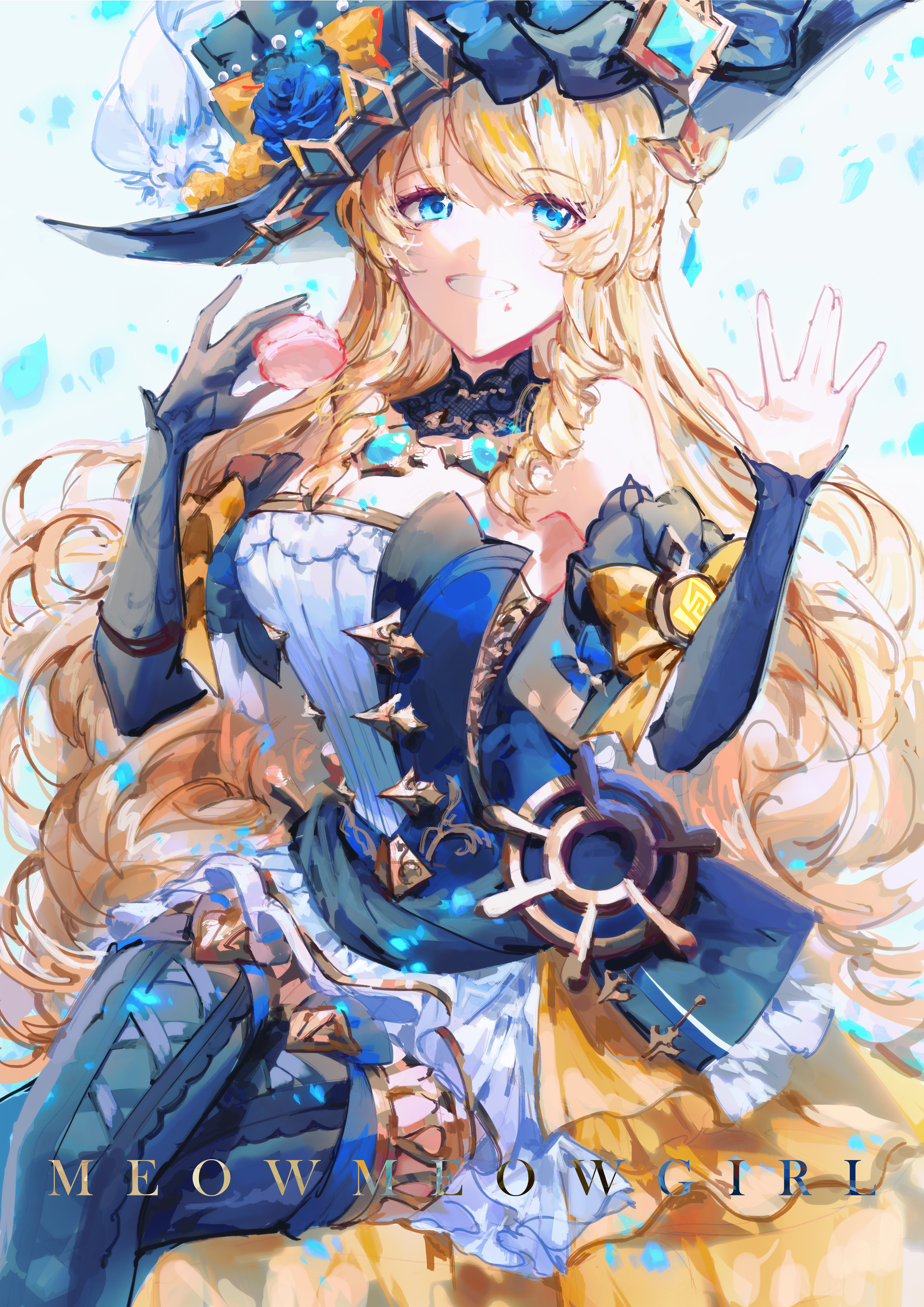 1girl absurdres artist_name bare_shoulders black_gloves black_hat black_sleeves black_thighhighs blonde_hair blue_eyes blue_gem bodice breasts commentary crossed_legs detached_sleeves dress drill_hair drill_sidelocks elbow_gloves english_commentary flower food gem genshin_impact gloves hat hat_flower highres holding holding_food lace-trimmed_collar lace_trim large_breasts long_hair looking_at_viewer macaron meowmeowgirl navia_(genshin_impact) parted_lips ship's_wheel_ornament showgirl_skirt sidelocks single_detached_sleeve single_elbow_glove sitting smile solo star_(symbol) star_in_eye strapless strapless_dress symbol_in_eye thighhighs very_long_hair waving