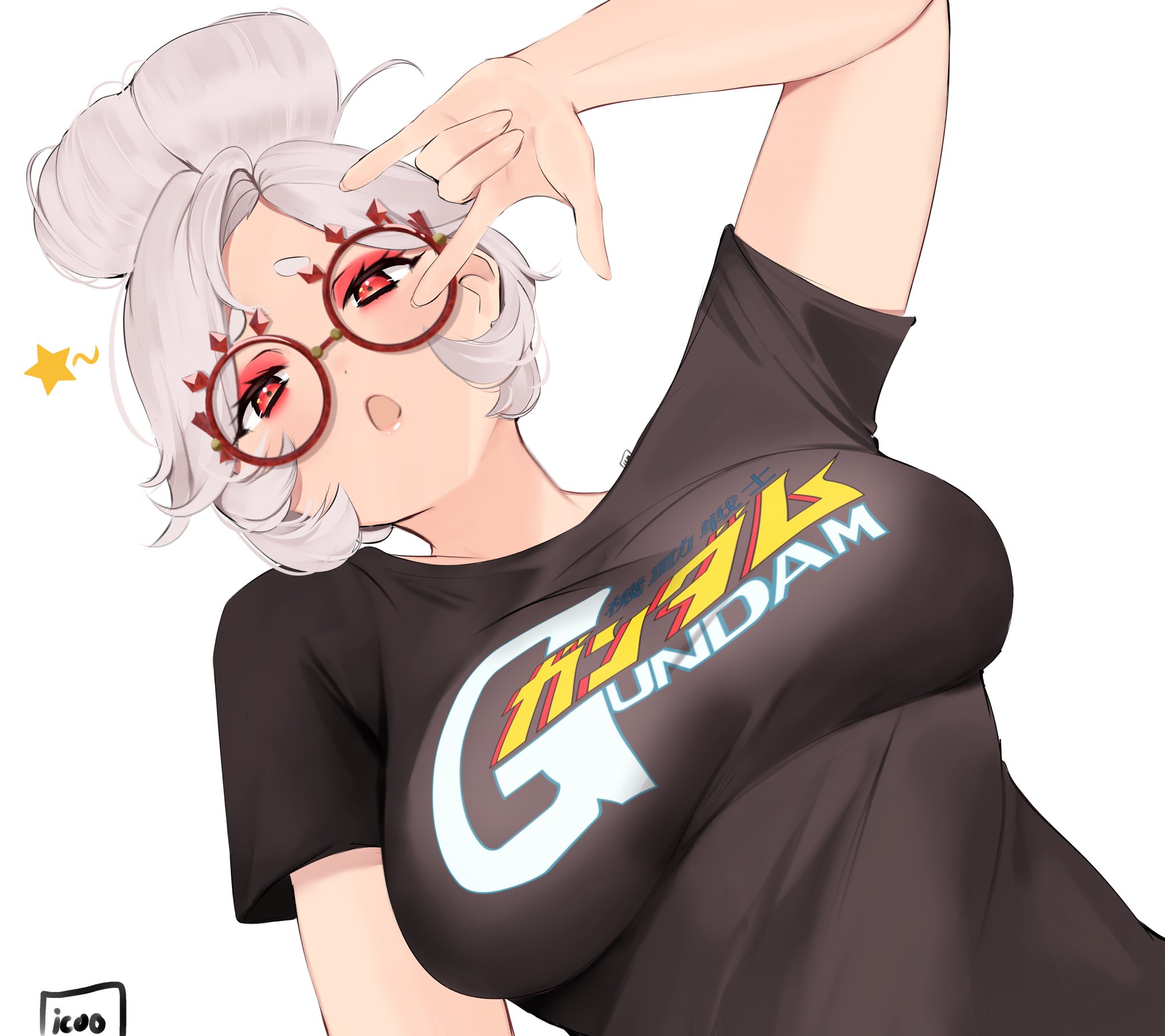 1girl alternate_costume breasts casual contemporary eyeshadow g_gundam glasses gundam highres icoo large_breasts looking_at_viewer love_(sign) makeup nintendo open_mouth purah red-framed_eyewear red_eyes round_eyewear sheikah shirt solo t-shirt the_legend_of_zelda the_legend_of_zelda:_tears_of_the_kingdom white_hair