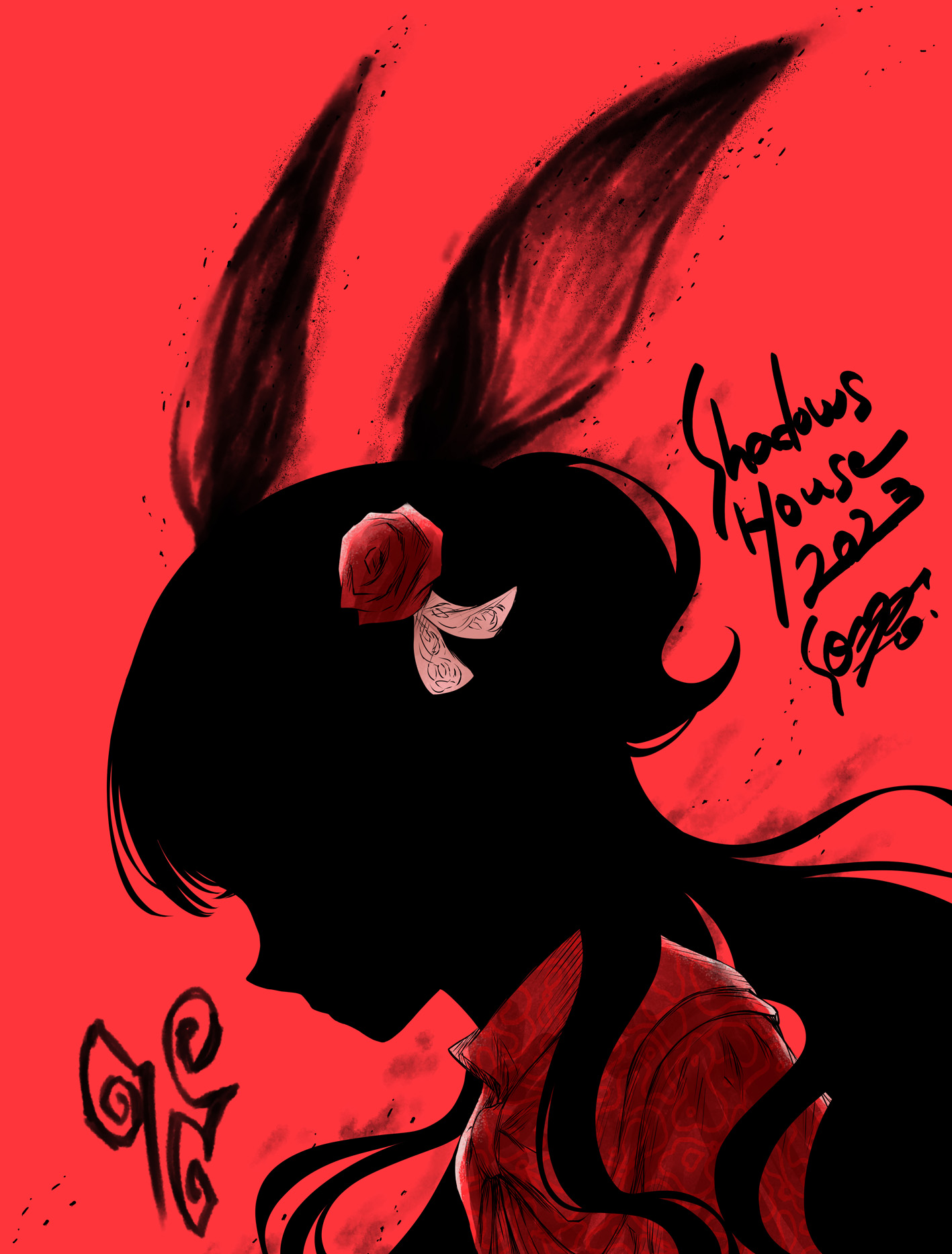 1girl commentary_request dated dress english_text flower from_side hair_flower hair_ornament hair_ribbon highres kate_(shadows_house) long_hair profile red_background red_dress red_flower red_rose ribbon rose shadow_(shadows_house) shadows_house solo soumatou_(mayoibashi) two_side_up upper_body white_ribbon