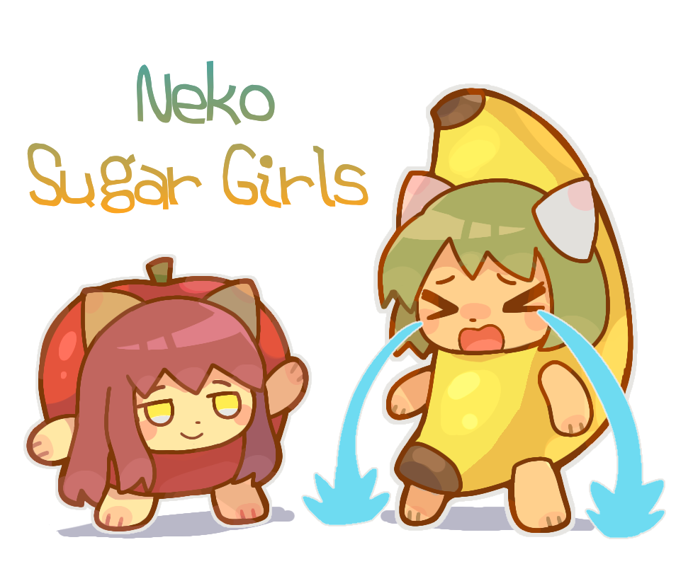 >_< 2girls animal_ears apple_costume banana_costume bien_kusuri brown_hair cat_ears chibi closed_eyes closed_mouth commentary_request copyright_name crying full_body green_hair koneko-chan long_hair looking_at_another multiple_girls nyan_neko_sugar_girls open_mouth raku-chan short_bangs short_hair simple_background smile standing streaming_tears tears white_background yellow_eyes