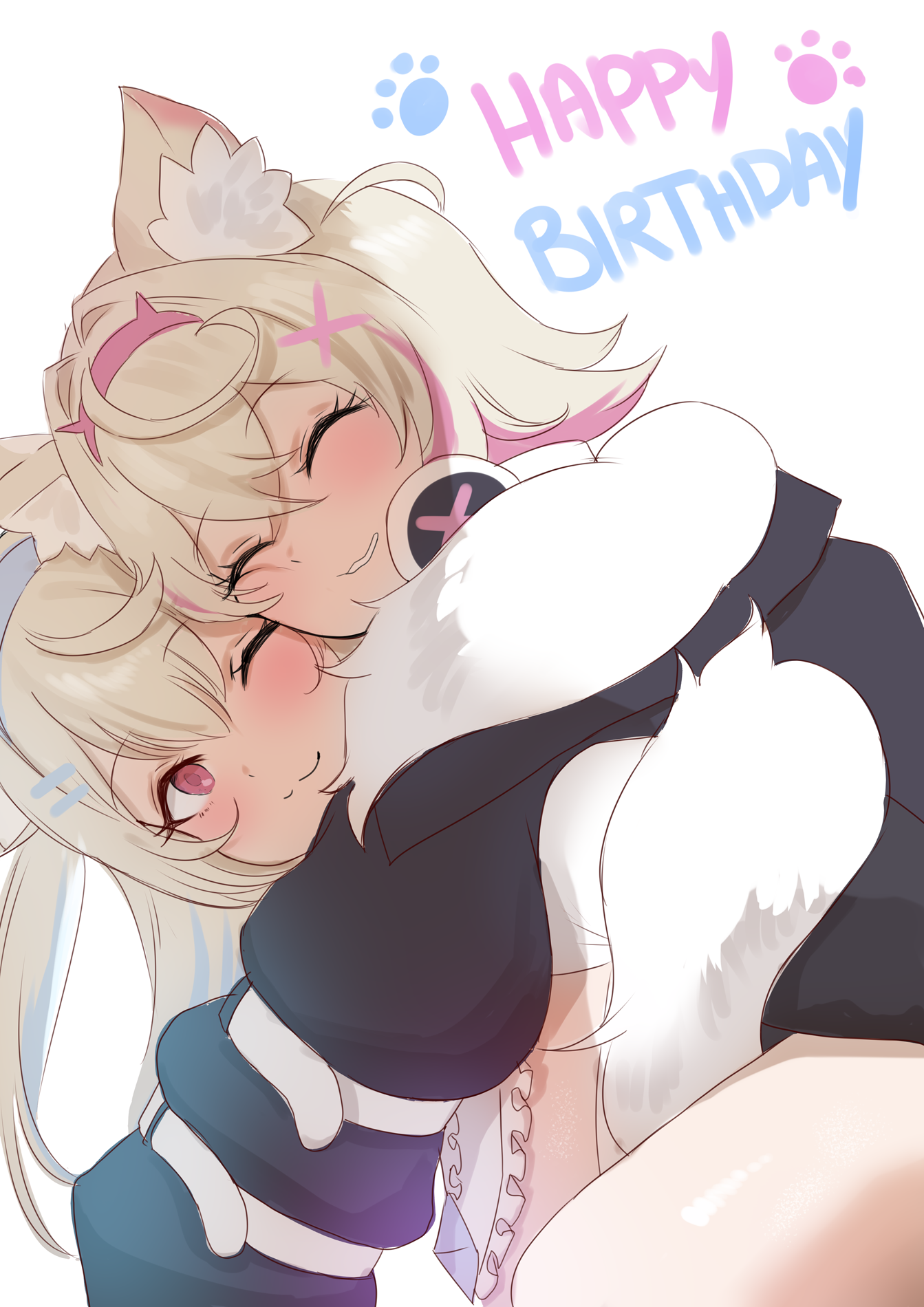 2girls animal_ear_fluff animal_ears blonde_hair blue_hair closed_eyes dog_ears dog_girl fur-trimmed_jacket fur_trim fuwawa_abyssgard fuwawa_abyssgard_(1st_costume) hairband happy_birthday headphones headphones_around_neck highres hololive hololive_english jacket mococo_abyssgard mococo_abyssgard_(1st_costume) multicolored_hair multiple_girls one_eye_closed pink_eyes pink_hair pink_hairband redi_(rasec_asdjh) siblings simple_background sisters streaked_hair twins virtual_youtuber white_background