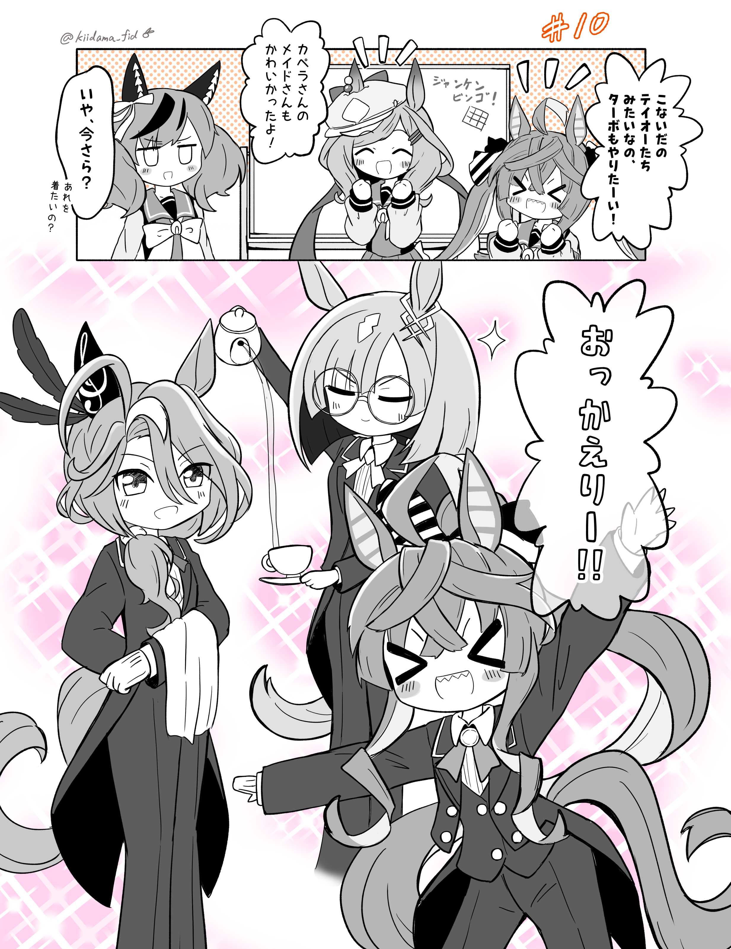 >_< 5girls absurdres ahoge alternate_costume animal_ears arm_behind_back arm_up bob_cut butler chalkboard coattails commentary_request crossdressing crossdressing_(ftm) crossed_bangs cup dress_shirt ear_covers ear_ornament ears_through_headwear feather_hair_ornament feathers female_butler glasses hair_ornament hair_over_shoulder hat highres holding holding_saucer holding_teapot horse_ears horse_girl horse_tail ikuno_dictus_(umamusume) jacket kiidama_fid leaning_forward long_hair looking_at_another matikanetannhauser_(umamusume) medium_hair multiple_girls neck_ribbon newsboy_cap nice_nature_(umamusume) notice_lines open_mouth pants partial_commentary partially_colored pouring ribbon round_eyewear saucer school_uniform serafuku shirt single_ear_cover smile sounds_of_earth_(umamusume) sparkle standing tail tailcoat teacup teapot tilted_headwear tracen_school_uniform translated twin_turbo_(umamusume) twintails twitter_username umamusume very_long_hair vest wing_collar