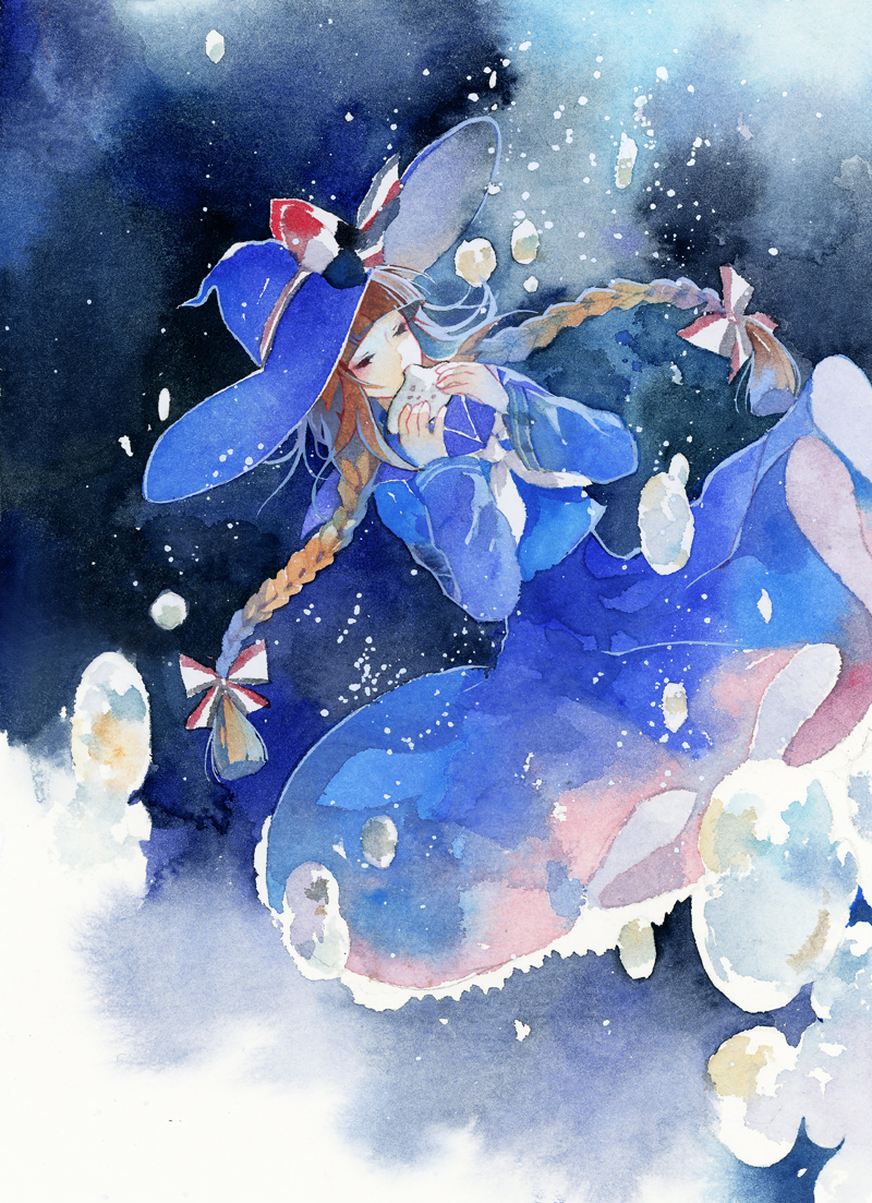 1girl air_bubble black_background black_eyes blue_background blue_dress blue_hat blue_theme braid brown_hair bubble closed_eyes dress dutch_angle floating frilled_dress frills funamusea hands_up hat holding holding_instrument instrument long_hair long_sleeves multicolored_background music ocarina oounabara_to_wadanohara painting_(medium) playing_instrument rei_(456789io) solo traditional_media twin_braids wadanohara watercolor_(medium) white_background witch_hat