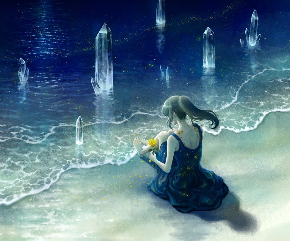 1girl bare_legs barefoot beach blue_dress brown_hair caustics crystal dress facing_away falling_petals flower holding holding_flower kazami_(kuroro) nape original petals petals_on_liquid ponytail rose shadow shore sidelocks sitting solo toes waves yellow_flower yellow_petals yellow_rose