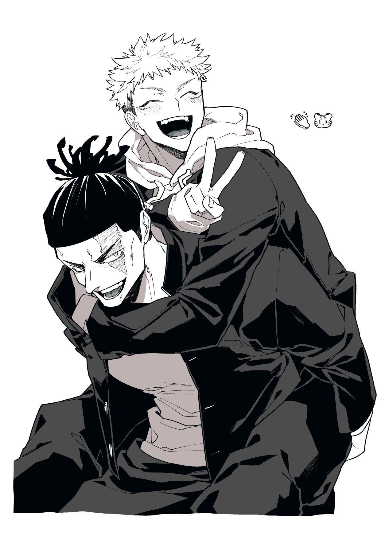 2boys ^_^ blush carrying closed_eyes couple cropped_legs eibm gakuran greyscale happy highres itadori_yuji jujutsu_kaisen laughing male_focus monochrome multiple_boys muscular muscular_male piggyback scar scar_across_eye scar_on_face school_uniform short_hair sideburns toudou_aoi_(jujutsu_kaisen) undercut v yaoi