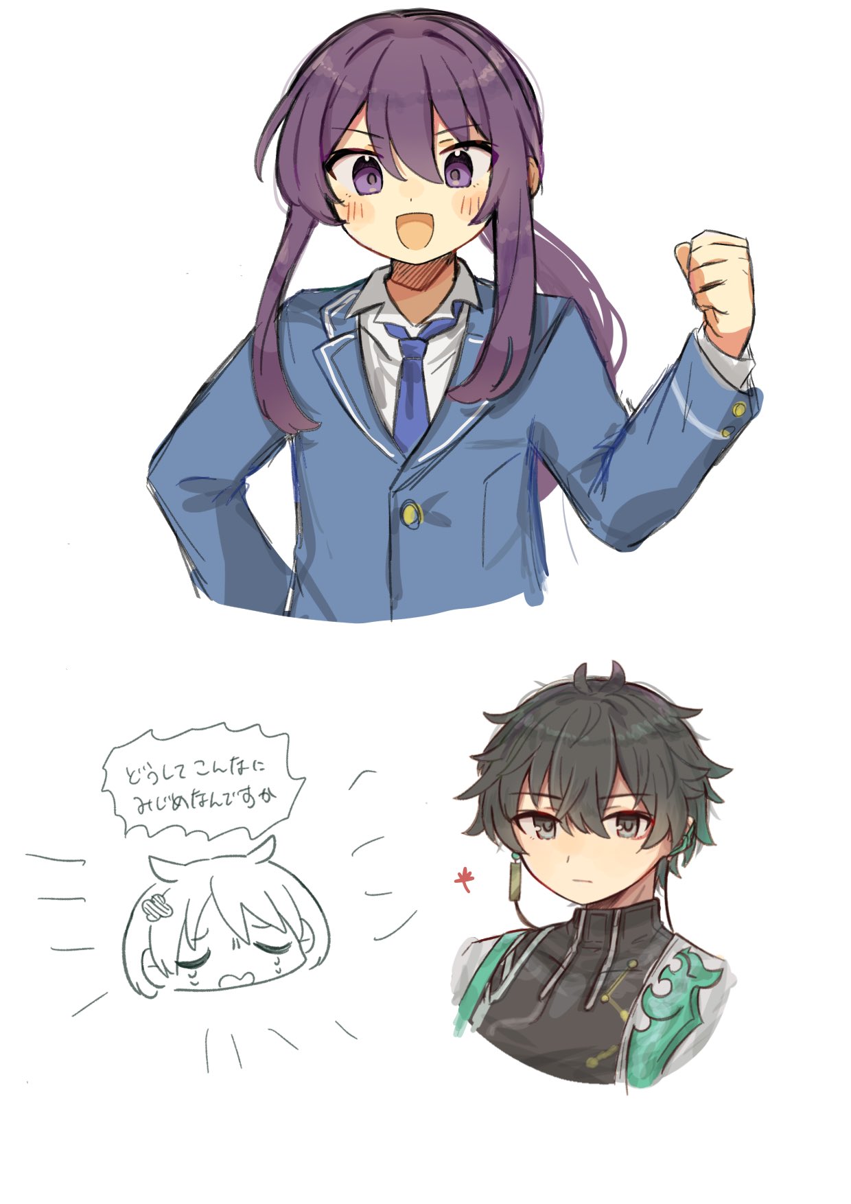 1girl 2boys :d azusa_mifuyu black_hair blazer blue_jacket blue_necktie buttons character_request check_character check_copyright clenched_hand closed_eyes commentary_request copyright_request cropped_arm cropped_shoulders cropped_torso crossover crying dan_heng_(honkai:_star_rail) doodle_inset earrings ensemble_stars! expressionless flower grey_eyes hair_flower hair_horns hair_ornament hand_on_own_hip hand_up hara_(nanohara) head_only highres honkai:_star_rail honkai_(series) jacket jewelry kanzaki_souma lapels layered_sleeves long_hair long_sleeves magia_record:_mahou_shoujo_madoka_magica_gaiden mahou_shoujo_madoka_magica multiple_boys multiple_girls necktie open_collar open_mouth ponytail portrait purple_eyes purple_hair school_uniform shirt short_hair simple_background smile suit_jacket translation_request turtleneck upper_body v-shaped_eyebrows white_background white_shirt yumenosaki_school_uniform
