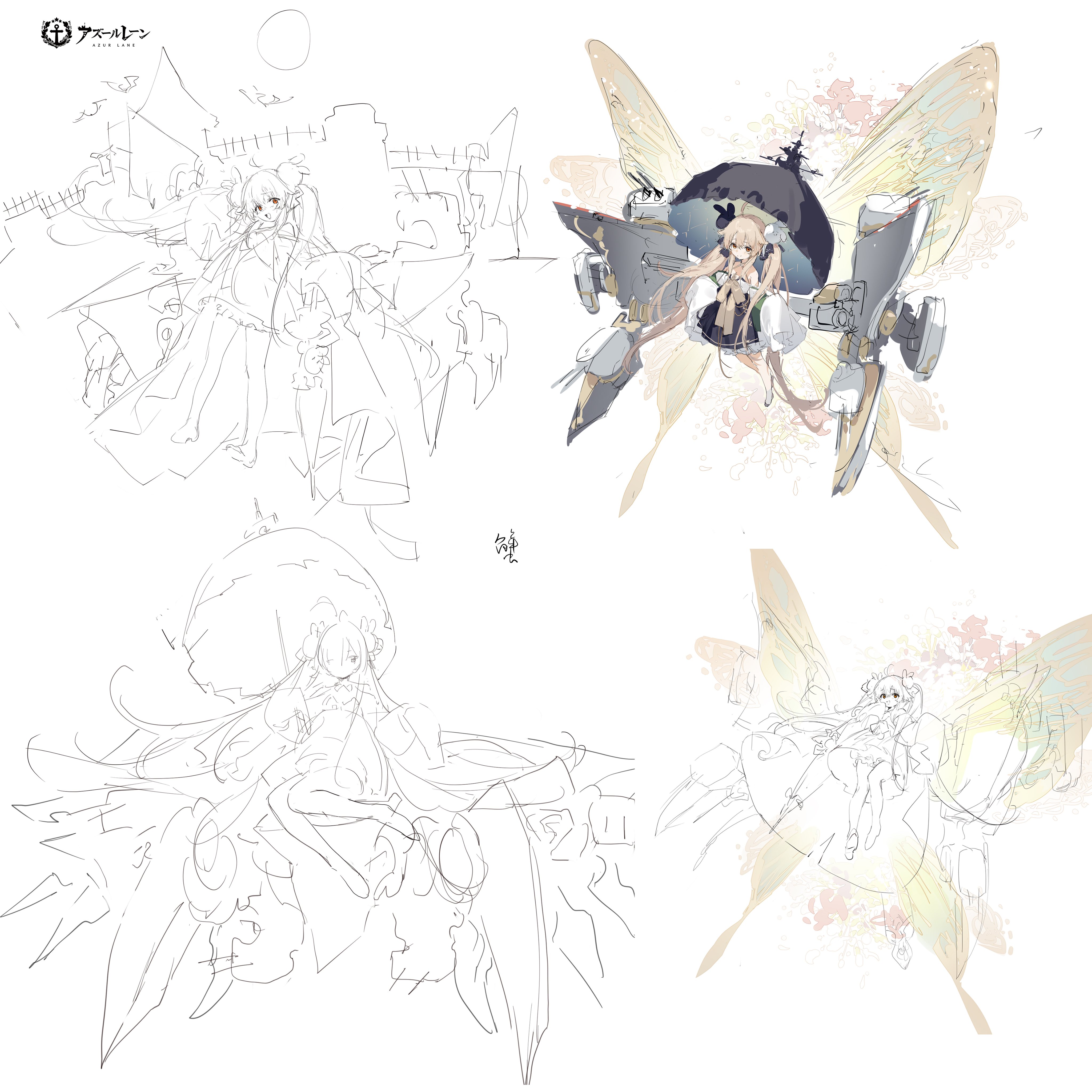 1girl absurdres attilio_regolo_(azur_lane) azur_lane black_dress black_umbrella blonde_hair butterfly_wings dress full_body highres insect_wings kurumi_(recycllamo) long_hair long_sleeves red_eyes rigging sketch sleeves_past_fingers sleeves_past_wrists umbrella very_long_hair wings