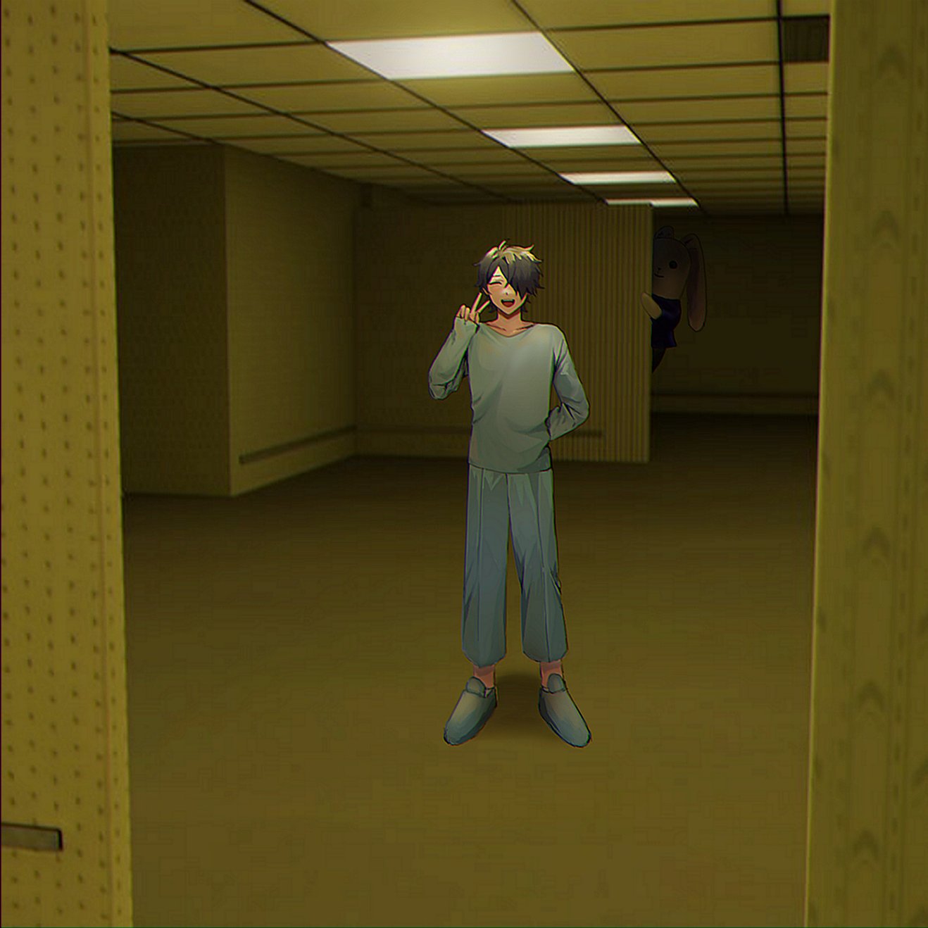 1boy backrooms_(creepypasta) blue_hair blue_pants blue_slippers full_body grey_shirt highres male_focus milgram one_eye_covered open_mouth pajamas pants sakurai_haruka_(milgram) shirt short_hair slippers smile solo v yunaalfr