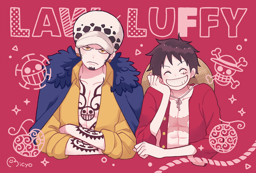 2boys arm_tattoo black_hair blue_coat character_name closed_eyes coat commentary_request crossed_arms earrings facial_hair fur_collar goatee hand_on_own_cheek hand_on_own_face hand_tattoo hat jewelry looking_at_viewer male_focus micyomon monkey_d._luffy multiple_boys one_piece open_clothes open_shirt red_shirt scar scar_on_chest scar_on_face shirt short_hair sideburns signature smile straw_hat tattoo trafalgar_law upper_body yellow_eyes yellow_shirt