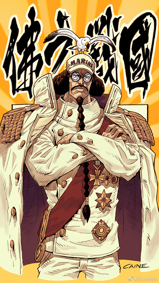 1boy artist_name baseball_cap beard bird black_hair braid braided_beard caine666 closed_mouth coat coat_on_shoulders crossed_arms english_text epaulettes facial_hair glasses hat looking_at_viewer male_focus medal mustache one_piece round_eyewear sengoku_(one_piece) solo third-party_source translation_request uniform watermark weibo_watermark