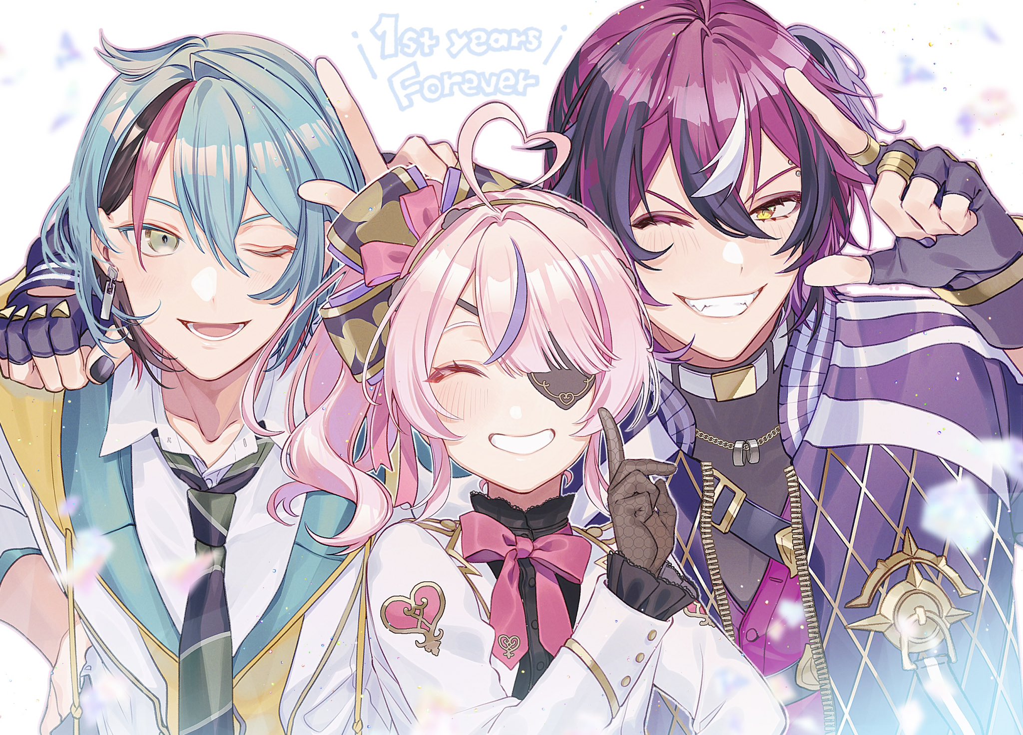 1girl 2boys black_gloves black_hair blue_hair bow bowtie closed_eyes collared_shirt cropped_jacket doppio_dropscythe doppio_dropscythe_(1st_costume) eyepatch fingerless_gloves gloves green_eyes grin hair_bow highres jacket kaburagi_(pnoir087) kyo_kaneko maria_marionette maria_marionette_(1st_costume) multicolored_hair multicolored_necktie multiple_boys necktie nijisanji nijisanji_en one_eye_closed open_clothes open_jacket pink_bow pink_bowtie pink_hair purple_hair school_uniform shirt side_ponytail smile streaked_hair virtual_youtuber white_hair white_jacket yellow_eyes