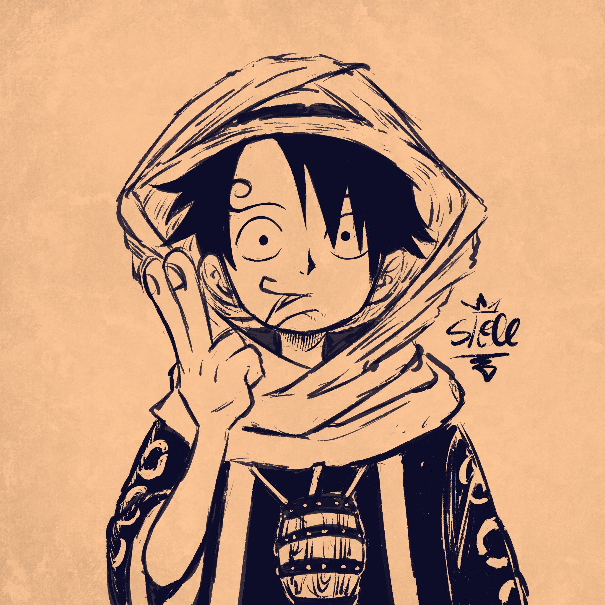 1boy cosplay curly_eyebrows hat highres looking_at_viewer male_focus monkey_d._luffy monochrome one_piece sanji_(one_piece) sanji_(one_piece)_(cosplay) sherumaru_(korcht06) short_hair signature simple_background straw_hat upper_body veil