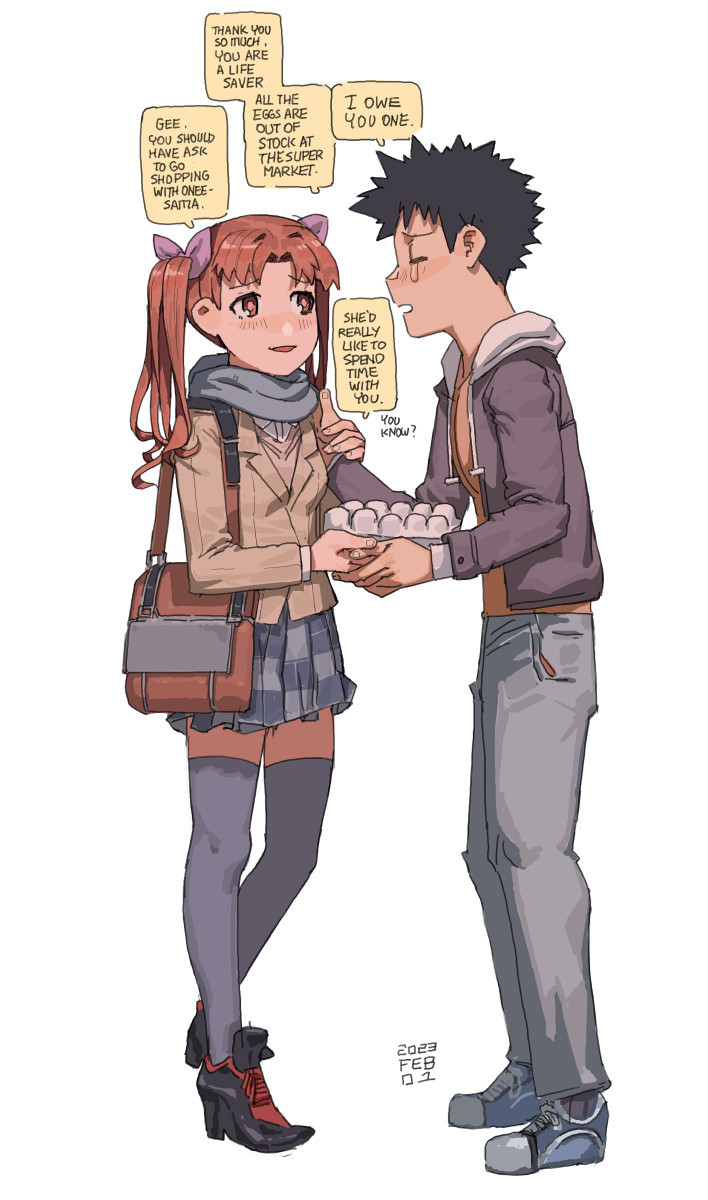 1boy 1girl 2023 ac120 bag black_hair black_thighhighs blue_footwear blue_scarf blue_skirt blush brown_hair cardigan closed_eyes dated egg_carton english_text full_body hair_ribbon high_heels highres holding kamijou_touma long_sleeves looking_at_another medium_hair pink_ribbon plaid_clothes plaid_skirt red_footwear ribbon scarf school_uniform shirai_kuroko shoes shoulder_bag simple_background skirt smile sneakers spreech_bubble standing thighhighs toaru_kagaku_no_railgun toaru_majutsu_no_index twintails white_background zettai_ryouiki