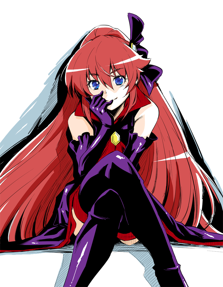1girl black_boots black_dress black_gloves black_ribbon blue_eyes boots closed_mouth commentary_request crossed_legs dress elbow_gloves genderswap genderswap_(mtf) gloves hair_ribbon happinesscharge_precure! kazuma_muramasa long_hair looking_at_viewer magical_girl phantom_(precure) ponytail precure red_hair ribbon shadow short_dress simple_background sitting sleeveless sleeveless_dress smile solo thigh_boots unlovely_(precure) very_long_hair white_background wide_ponytail