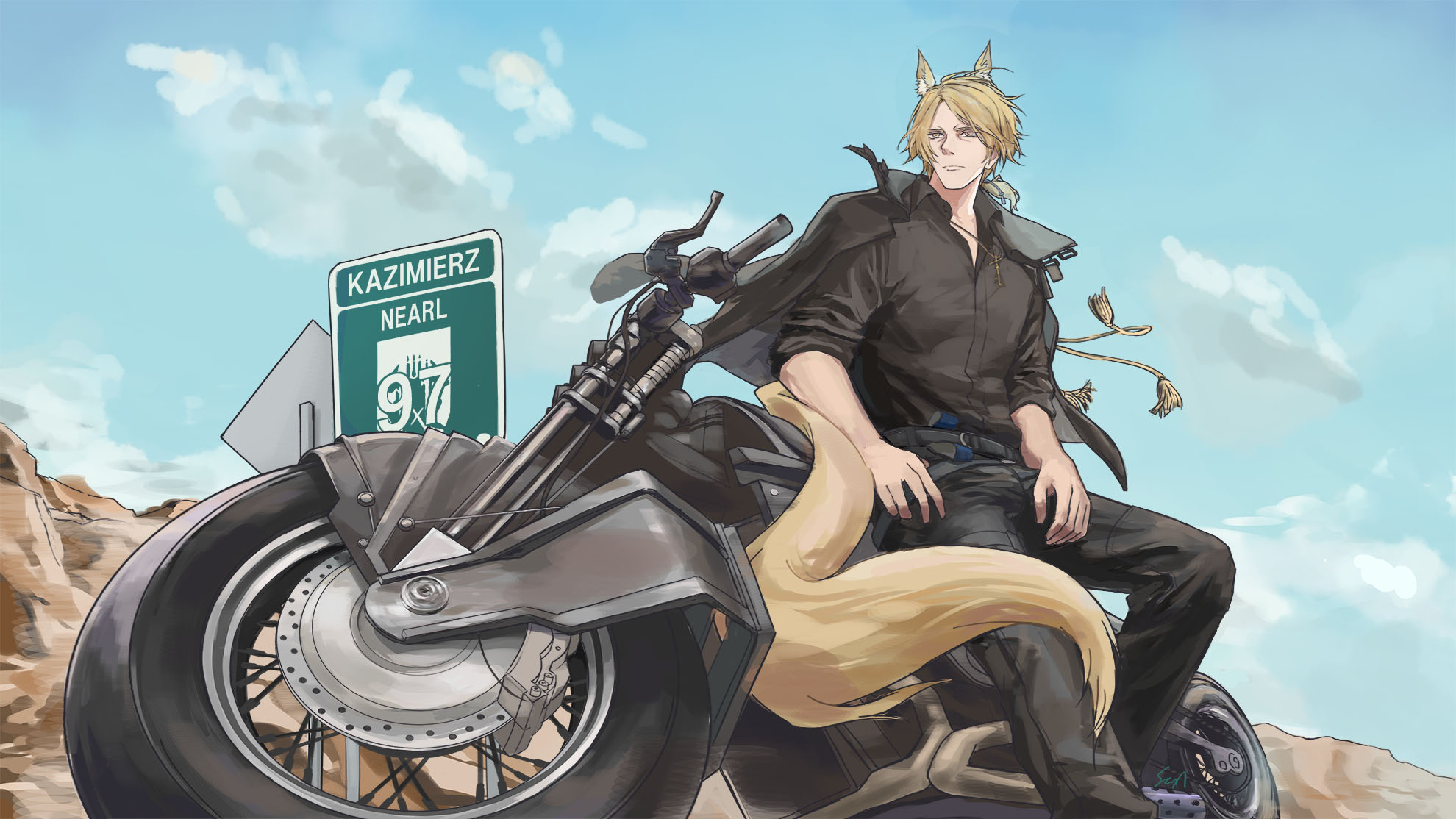 1boy animal_ear_fluff animal_ears arknights belt black_coat black_pants black_shirt blonde_hair blue_sky character_name cloud coat coat_on_shoulders day desert highres horse_boy horse_ears horse_tail leaning_on_object male_focus medium_hair mlynar_(arknights) motor_vehicle motorcycle outdoors pants setsuka_(okuna_sin) shirt sky sleeves_rolled_up solo tail yellow_eyes