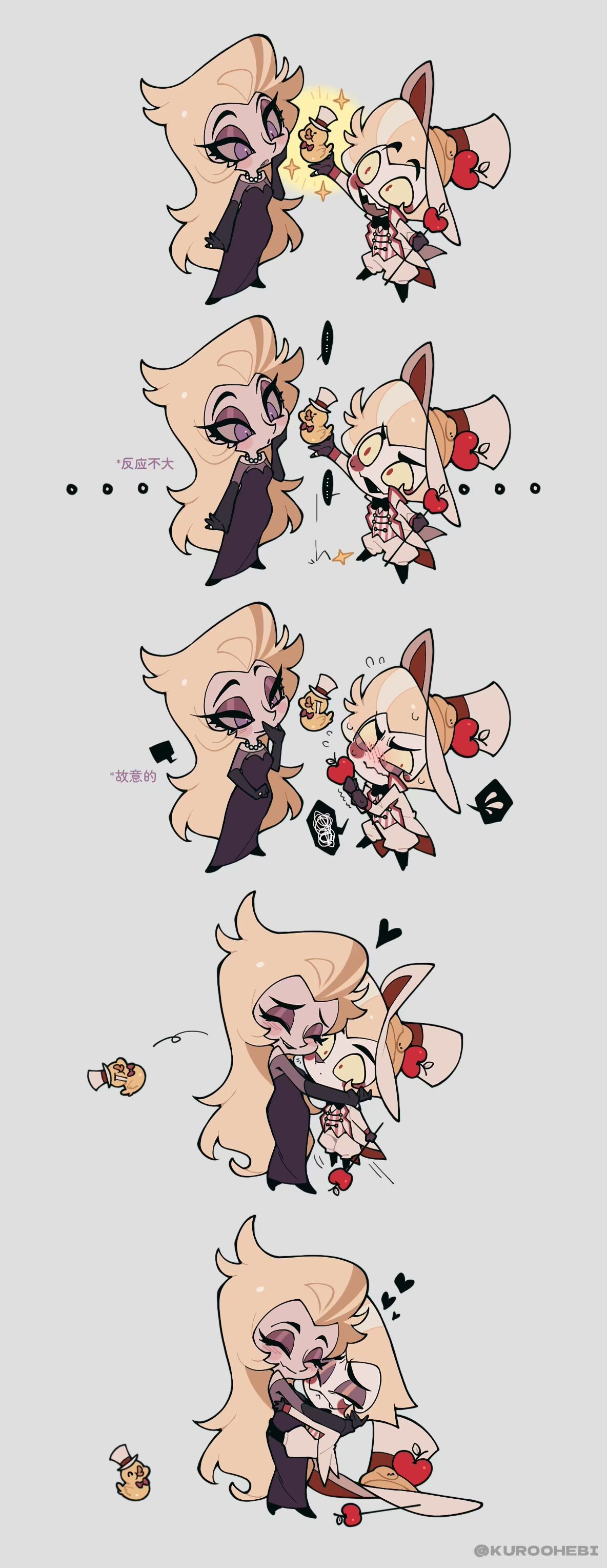 1boy 1girl absurdres bird blonde_hair blush demon demon_boy demon_girl dress duck hazbin_hotel heiwei_she_xiong hellaverse highres husband_and_wife lilith_(hazbin_hotel) looking_at_another lucifer_morningstar_(hazbin_hotel) purple_dress