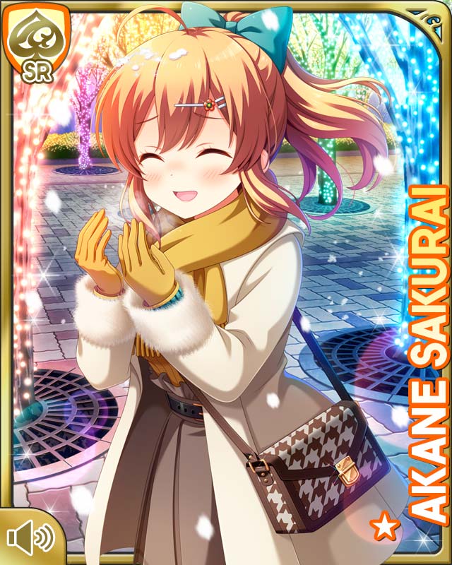 1girl :d black_socks blue_bow bow brown_coat brown_dress brown_eyes brown_hair card_(medium) closed_eyes coat dress girlfriend_(kari) gloves hair_ornament lights looking_at_viewer neckwear night official_art open_mouth outdoors ponytail qp:flapper sakurai_akane_(girlfriend_(kari)) scarf smile snow socks standing winter_clothes yellow_gloves yellow_scarf