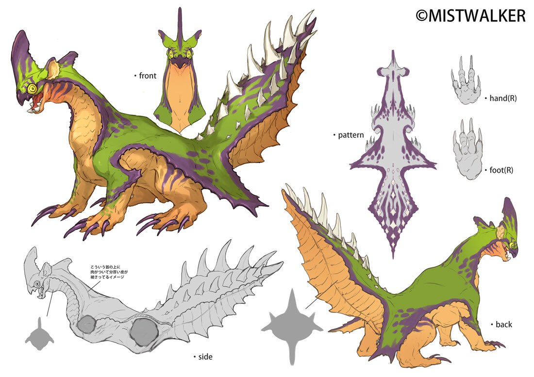 animal_focus reference_sheet claws commentary_request company_name copyright_notice fangs fantasian from_side full_body looking_at_viewer monster multiple_views no_humans open_mouth ringed_eyes simple_background spikes translation_request white_background yamamura_le yellow_eyes