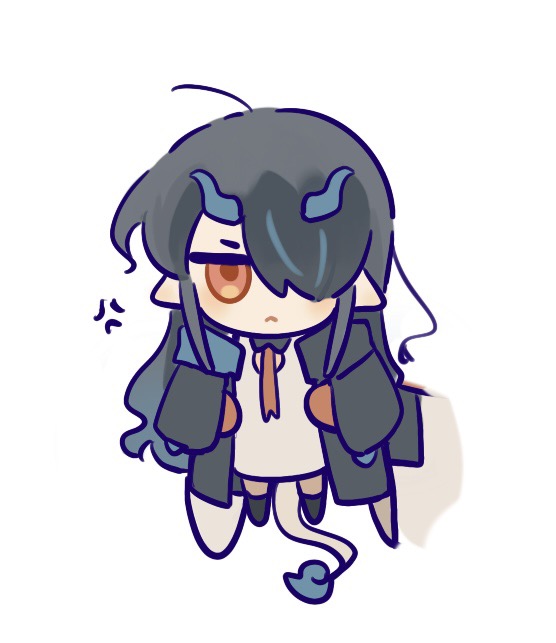 2girls anger_vein arknights black_hair black_jacket carrying carrying_person chibi chinese_commentary closed_mouth colored_skin commentary_request cropped_arm dragon_horns dress dusk_(arknights) full_body hair_over_one_eye horns jacket long_hair long_sleeves looking_at_viewer multiple_girls necktie nian_(arknights) open_clothes open_jacket red_eyes red_necktie sifeizui simple_background solo_focus white_background white_dress