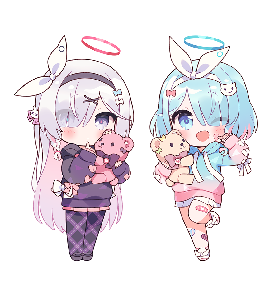 arona_(blue_archive) black_eyes black_footwear black_hairband black_hoodie black_pantyhose blue_archive blue_eyes blue_hair blue_halo blue_hoodie blush closed_mouth colored_inner_hair grey_hair hair_ornament hair_over_one_eye hairband halo hood hoodie kano_hito long_hair long_sleeves multicolored_hair one_eye_closed open_mouth pantyhose pink_hair plana_(blue_archive) red_halo shoes short_hair simple_background smile stuffed_animal stuffed_toy teddy_bear white_background white_footwear x_hair_ornament