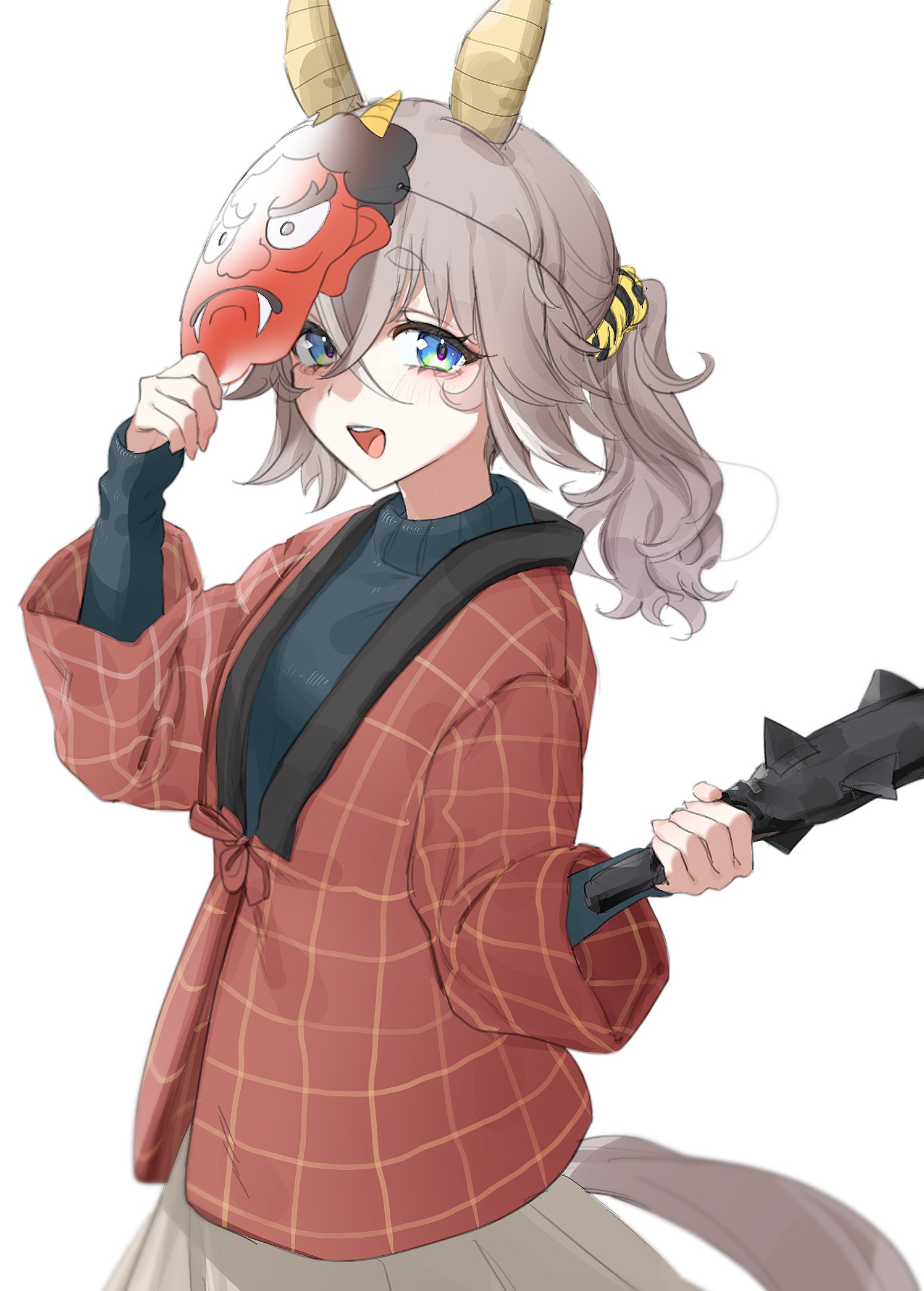 1girl animal_ears blue_eyes ear_covers grey_hair hair_between_eyes highres holding horse_ears horse_girl horse_tail long_hair looking_at_viewer mask ningen3333 open_mouth ponytail smile solo tail thick_eyebrows umamusume wonder_acute_(umamusume)