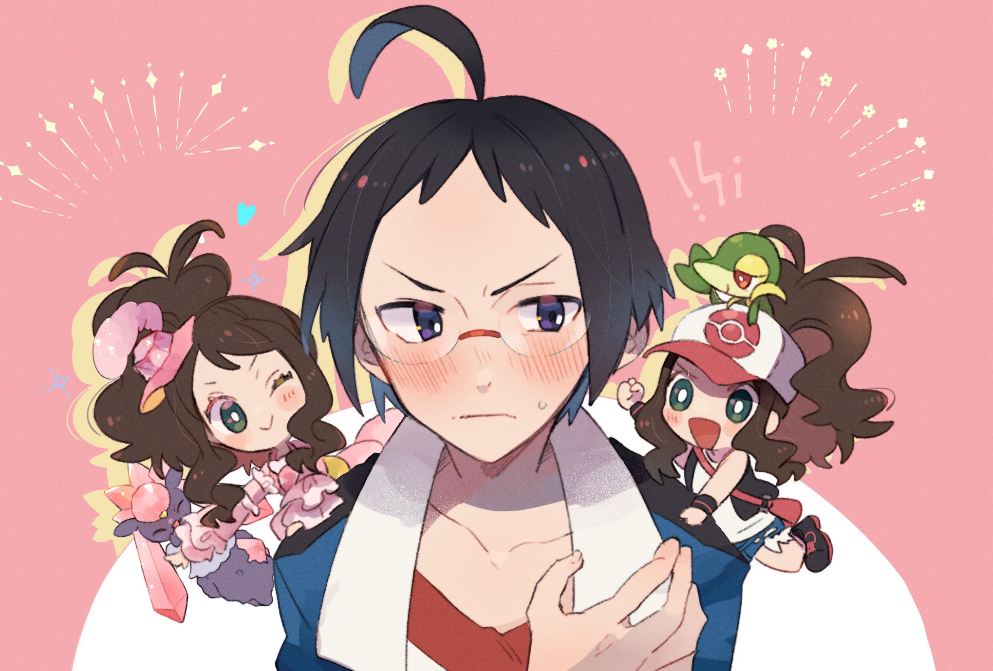 1boy 2girls :> :d ahoge baseball_cap blue_eyes bright_pupils brown_hair bush cheren_(pokemon) chibi collarbone diancie dual_persona gen_5_pokemon gen_6_pokemon glasses hat heart highres hilda_(pokemon) hilda_(special_costume)_(pokemon) legendary_pokemon long_hair misha_(ohds101) multiple_girls mythical_pokemon nintendo one_eye_closed open_mouth pink_background pokemon pokemon_(creature) pokemon_bw pokemon_masters_ex print_headwear simple_background smile snivy sparkle v-shaped_eyebrows white_pupils