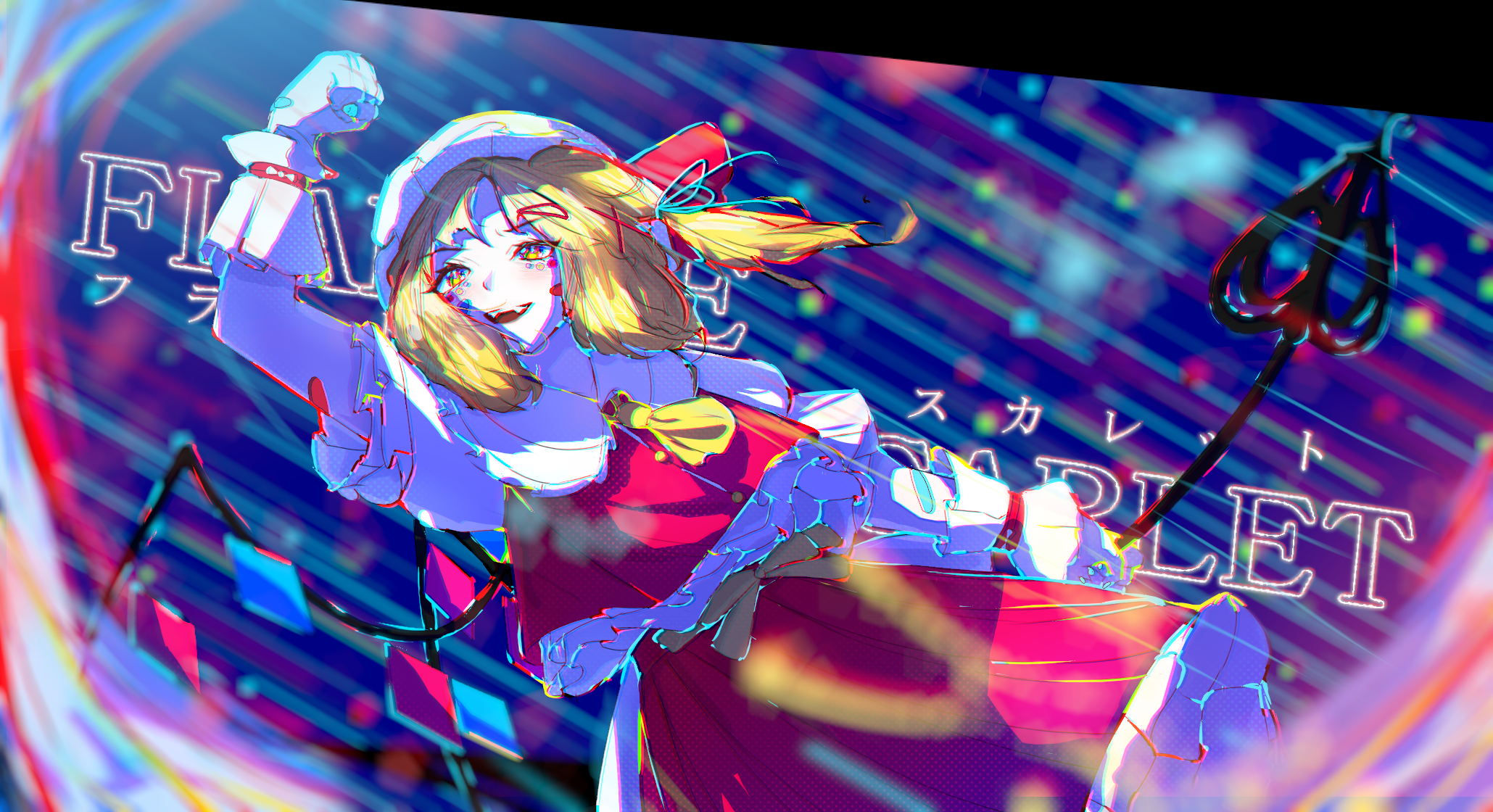 1girl bandages blonde_hair blurry blurry_background blurry_foreground bonnet bow chadntartist character_name collar colorful crystal decorations flandre_scarlet frilled_bonnet frills hair_tie halftone highres laevatein_(touhou) mika_pikazo_(style) multicolored_background necktie red_shirt red_skirt ribbon shirt skirt touhou white_collar wings wristwear yellow_eyes