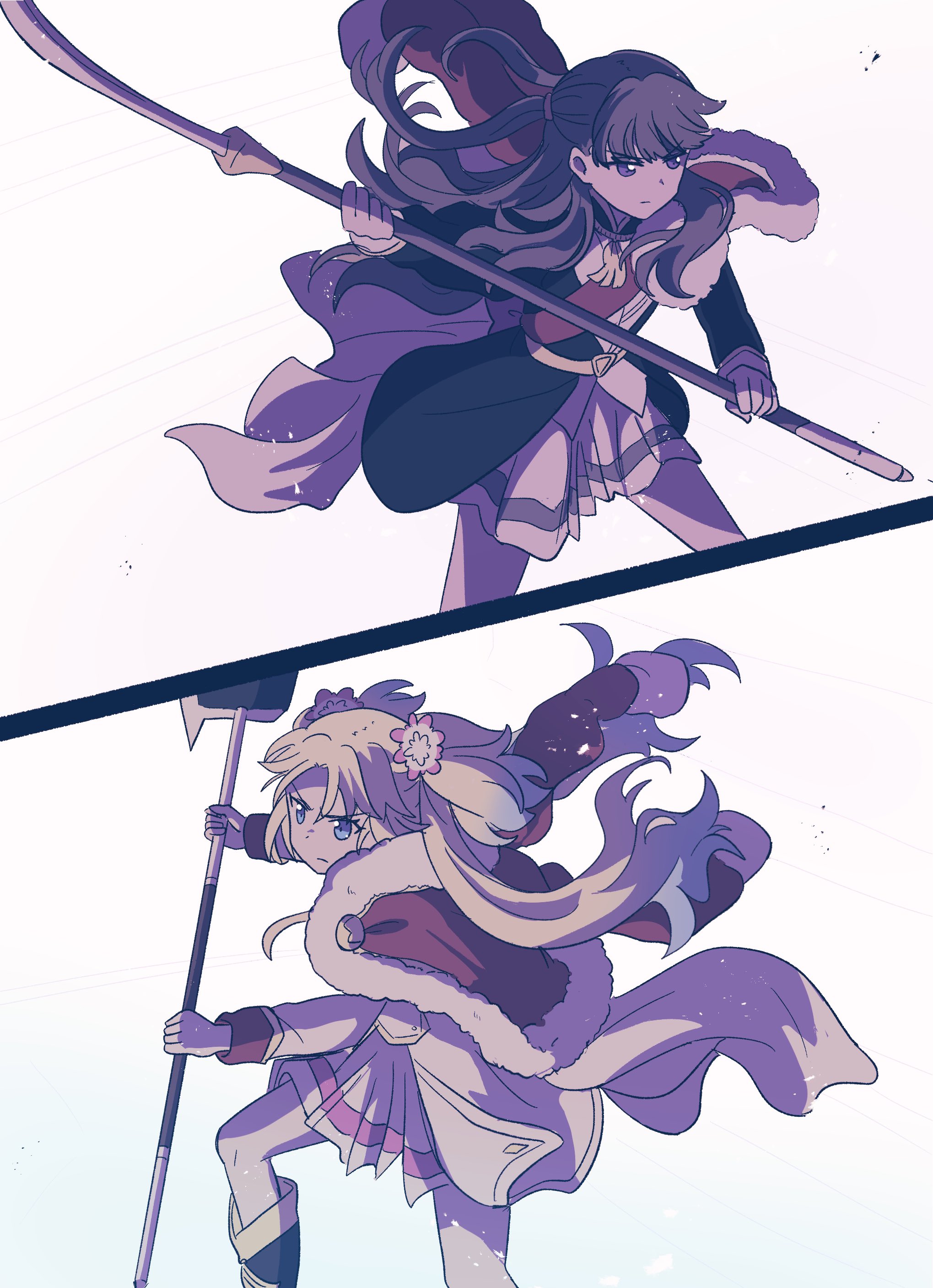 2girls absurdres blonde_hair boots brown_hair cosplay fujishima_megumi fur-trimmed_jacket fur_trim hanayagi_kaoruko hanayagi_kaoruko_(cosplay) highres holding holding_polearm holding_weapon isurugi_futaba isurugi_futaba_(cosplay) jacket jacket_on_shoulders knee_boots link!_like!_love_live! long_hair long_sleeves love_live! mira-cra_park! multiple_girls osawa_rurino pleated_skirt polearm red_jacket sash shoujo_kageki_revue_starlight skirt split_screen twintails upper_body v-shaped_eyebrows watage_modoki weapon white_background white_jacket white_skirt