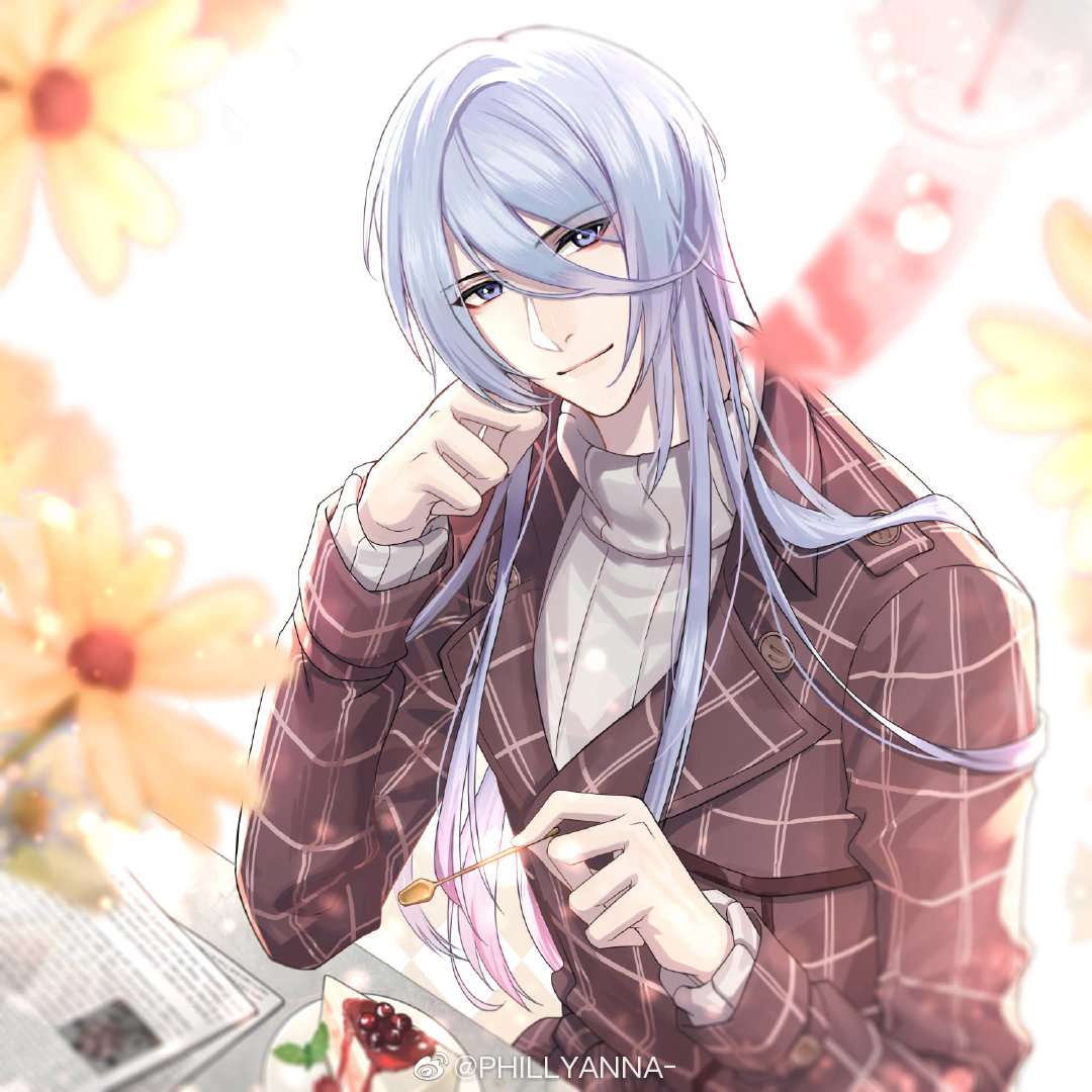 1boy blue_hair blurry blurry_foreground brown_coat cael_anselm cael_anselm_(winter_wishes) cake cake_slice cheesecake chinese_commentary closed_mouth coat daisy_(flower) elbow_rest flower food hair_between_eyes head_rest holding holding_spoon jam light_blue_hair long_bangs long_hair long_sleeves looking_at_viewer lovebrush_chronicles male_focus newspaper official_alternate_costume phillyanna plaid_clothes plaid_coat plate purple_eyes ribbed_sweater sitting smile solo spoon sweater table turtleneck turtleneck_sweater upper_body white_background white_sweater wind_chime yellow_flower