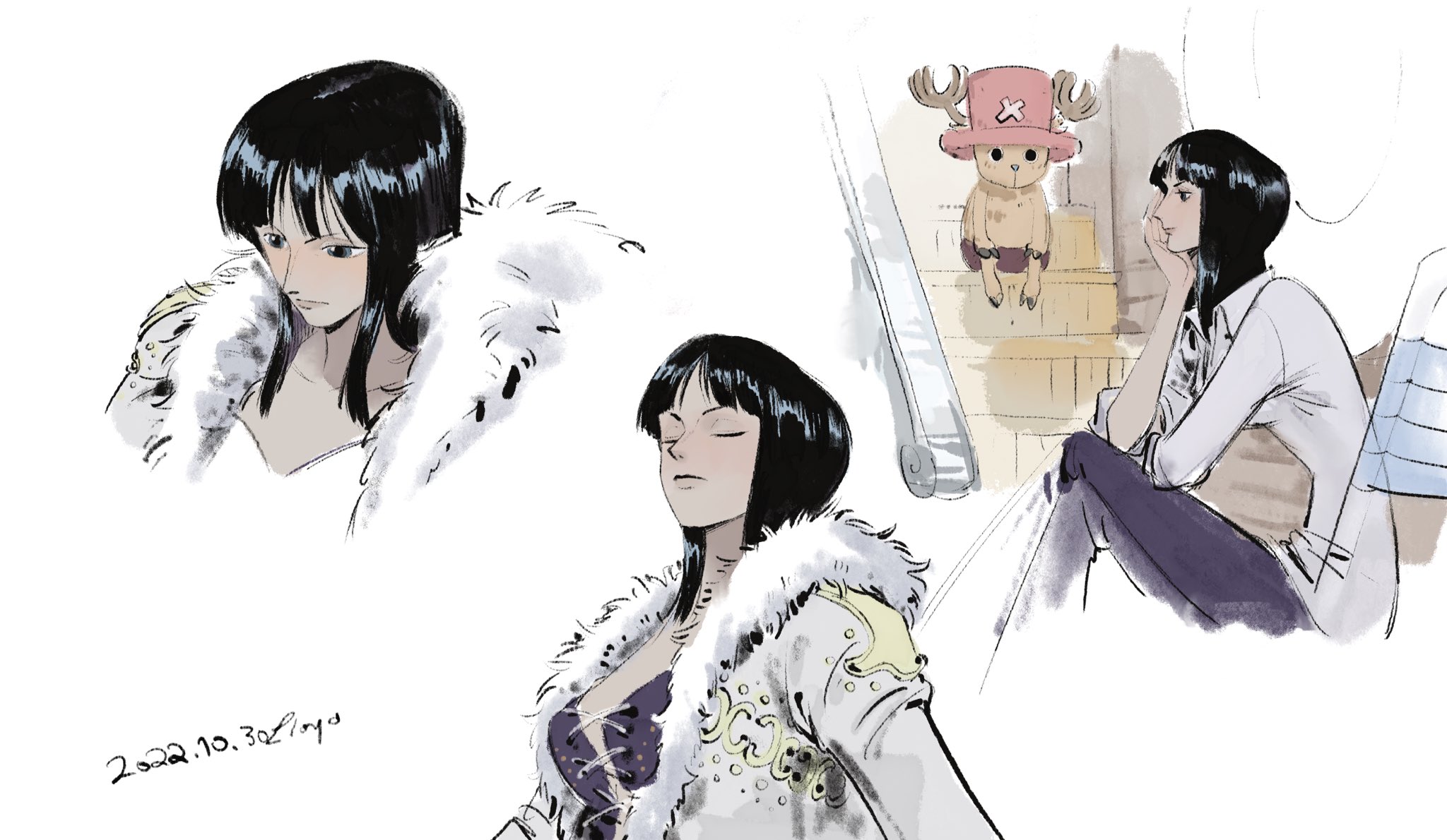 antlers black_eyes black_hair blue_eyes blunt_bangs chair closed_eyes coat collared_shirt cross-laced_clothes cross-laced_top crossed_legs dated from_above fur_collar hand_on_own_chin hat highres horns linerynlasgalen looking_ahead looking_at_another medium_hair multiple_views nico_robin nico_robin_(alabasta) one_piece purple_shirt reindeer_antlers shirt sidelocks sitting sitting_on_stairs stairs tony_tony_chopper white_coat