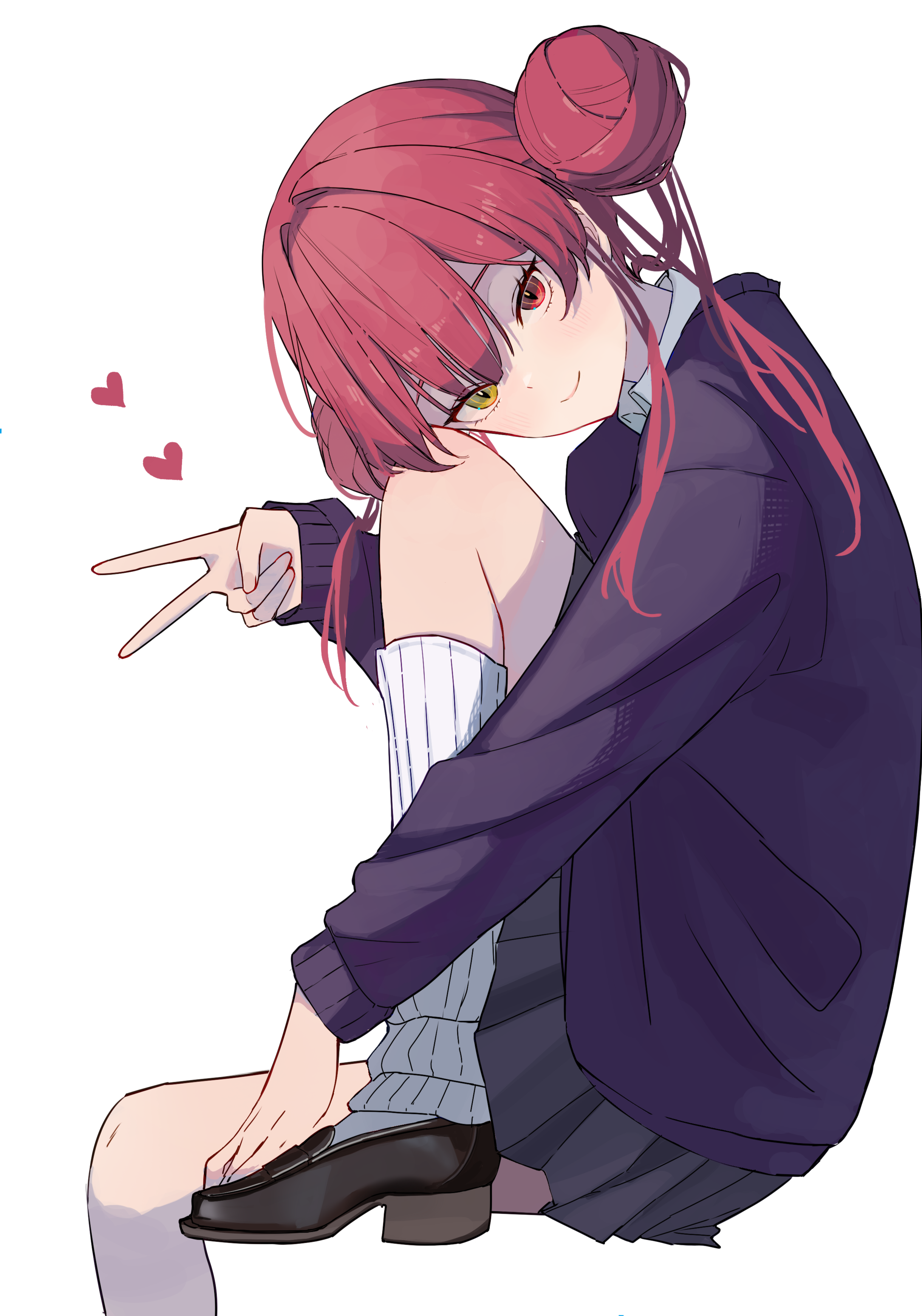 1girl absurdres alternate_costume alternate_hairstyle black_shoes black_skirt blue_jacket blue_shirt closed_mouth commentary_request double_bun grey_background hair_bun heart heterochromia highres hololive houshou_marine jacket knee_up kneehighs loafers long_hair long_sleeves looking_at_viewer miyononon pleated_skirt red_eyes red_hair school_uniform shirt shoes simple_background sitting skirt smile socks solo v virtual_youtuber white_socks yellow_eyes