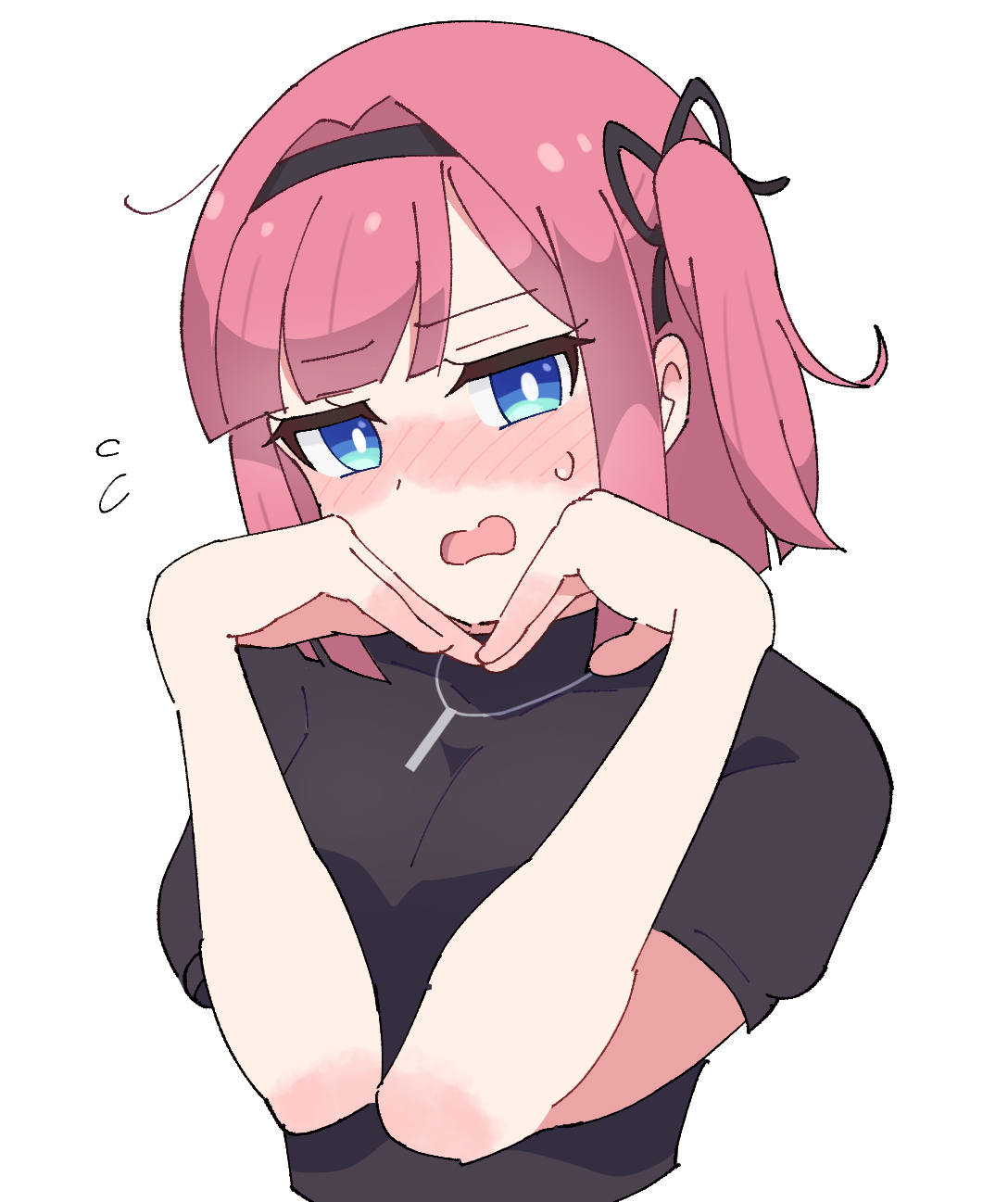 1girl black_hairband black_ribbon black_shirt blouse blue_eyes blush hair_ornament hair_ribbon hairband heart heart_hands highres jewelry looking_at_viewer mochizuki_momiji nagumo_uka necklace new_game! pink_hair ribbon shirt short_hair short_sleeves simple_background solo white_background