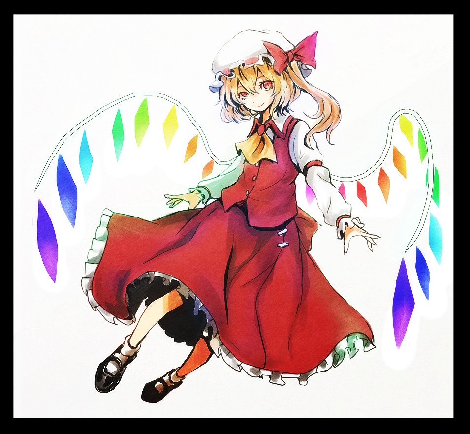 1girl adapted_costume ascot black_border black_shoes border bow buttons closed_mouth collared_shirt flandre_scarlet frilled_skirt frills full_body haiki_(hakkyoii06) hair_bow hat light_smile long_skirt long_sleeves looking_at_viewer mary_janes mob_cap multicolored_wings one_side_up red_bow red_eyes red_ribbon red_skirt red_vest ribbon ribbon-trimmed_headwear ribbon_trim shirt shoes skirt sleeve_ribbon socks solo touhou vest white_background white_socks wings yellow_ascot