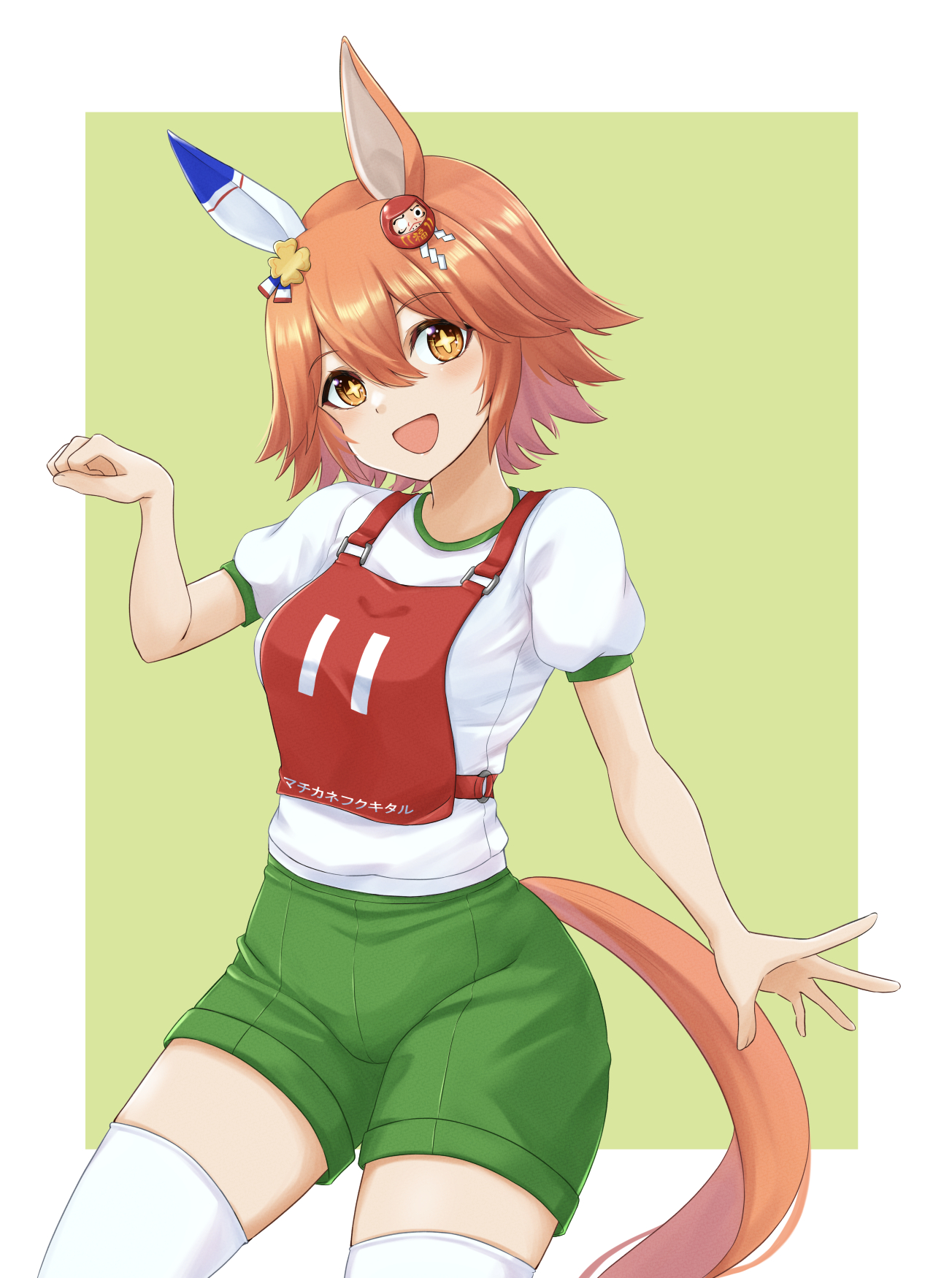 +_+ 1girl animal_ears character_name clover_hair_ornament commentary cowboy_shot daruma_doll ear_covers green_background green_shorts gym_shirt gym_shorts gym_uniform hair_ornament highres horse_ears horse_girl horse_tail kemuri_(etep3372) looking_at_viewer matikanefukukitaru_(umamusume) open_mouth orange_eyes orange_hair race_bib shirt short_hair short_sleeves shorts single_ear_cover smile solo standing tail thighhighs translated umamusume white_shirt white_thighhighs