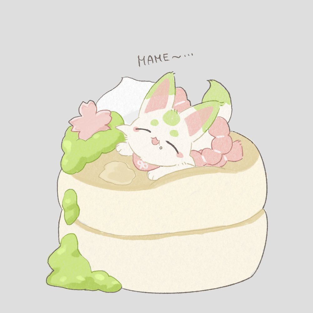 65tan_tl :3 animal animal_focus cherry_blossoms closed_eyes clothed_animal cream facing_viewer food food_on_face fox grey_background happy in_food lying mamenosuke_(touken_ranbu) matcha_(food) no_humans on_stomach open_mouth oversized_food oversized_object pancake pancake_stack red_scarf rope scarf shimenawa simple_background solo touken_ranbu
