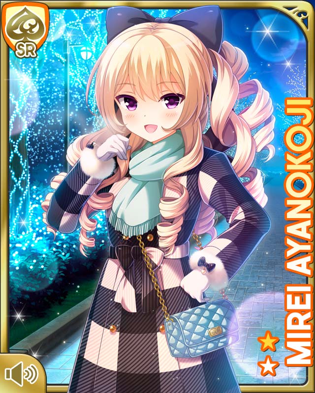1girl ayanokoji_mirei black_bow black_coat blonde_hair blue_scarf bow card character_name coat curly_hair drill_hair girlfriend_(kari) gloves hair_ornament long_hair night official_art open_mouth ouju outdoors pink_sweater plaid_clothes plaid_coat purple_eyes qp:flapper ringlets scarf smile solo standing sweater tagme very_long_hair white_gloves winter_clothes winter_coat