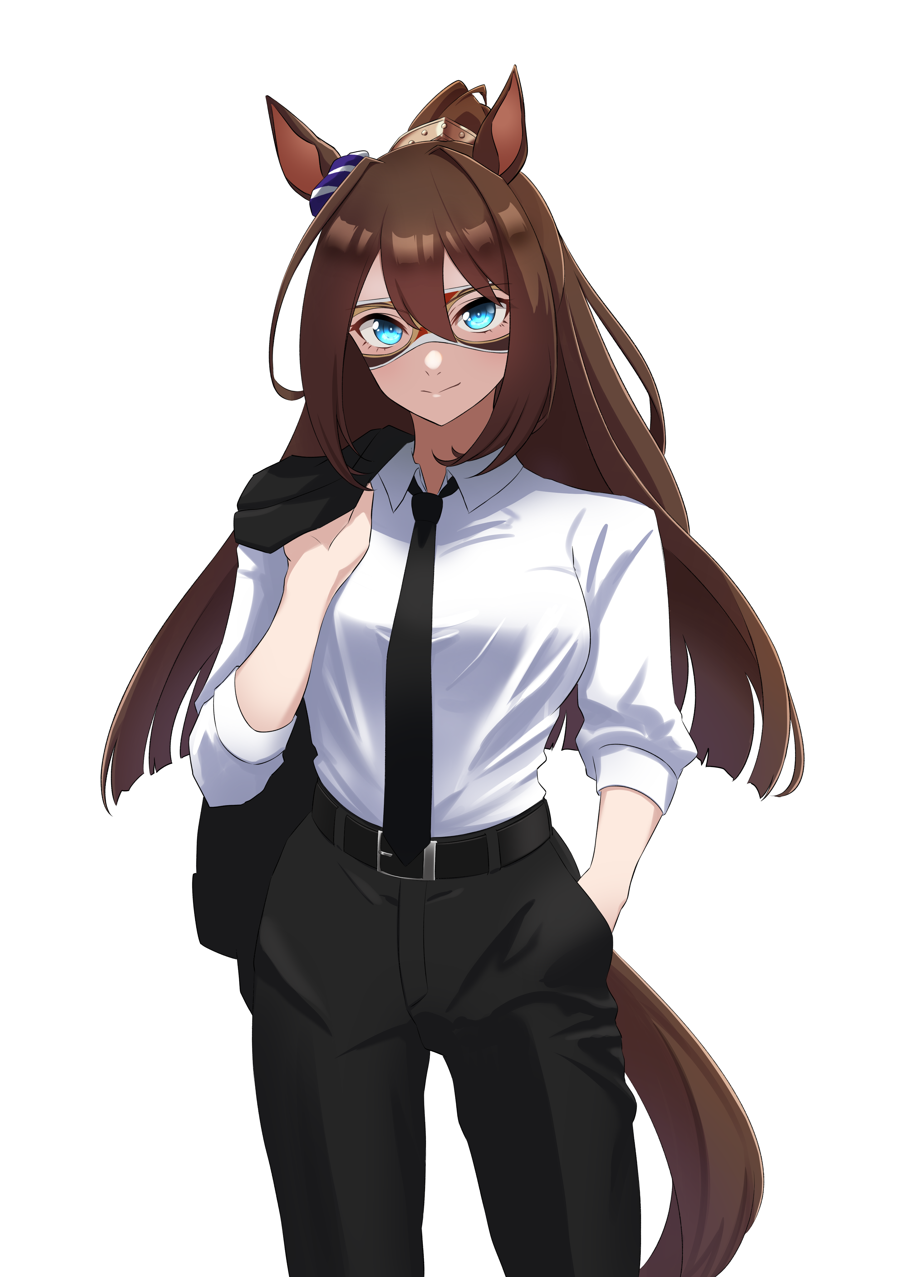 1girl absurdres alternate_costume animal_ears belt black_belt black_necktie black_pants blue_eyes brown_hair collared_shirt commentary_request domino_mask ear_ornament el_condor_pasa_(umamusume) eye_mask hair_between_eyes hand_in_pocket highres holding holding_jacket holding_unworn_clothes horse_ears horse_girl horse_tail jacket long_hair long_sleeves mask necktie pants ponytail senchan_7 shirt silk simple_background sleeves_rolled_up solo spider_web tail umamusume unworn_jacket very_long_hair white_background white_shirt
