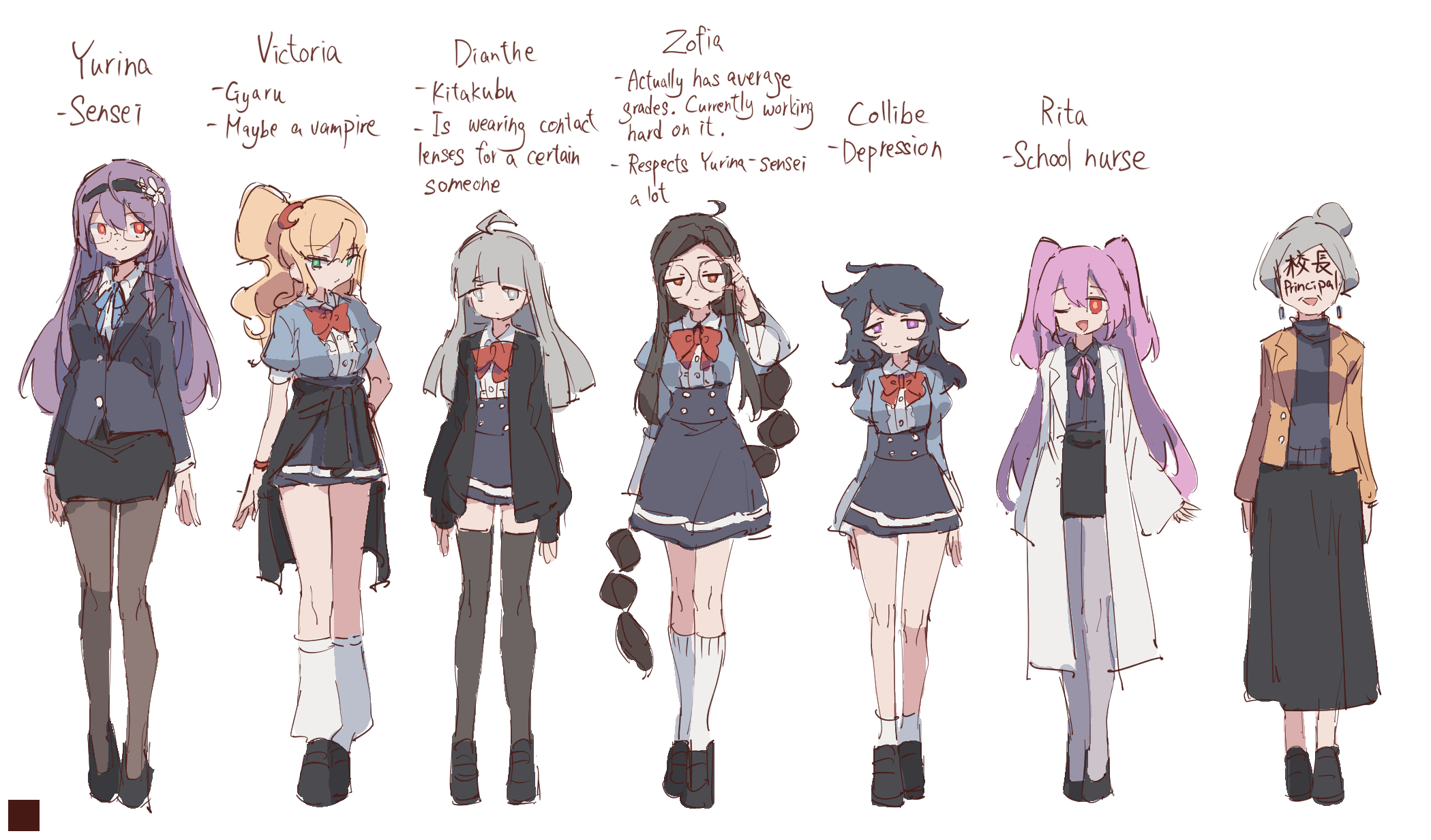 6+girls adjusting_eyewear ahoge arms_at_sides bilingual_text black_footwear black_hair black_hairband black_jacket black_pantyhose black_shirt black_skirt black_sweater black_thighhighs blonde_hair blue_ribbon blue_shirt blue_skirt blunt_bangs bow bowtie bracelet breasts bright_pupils brown_eyes brown_hair buttons center_frills character_name closed_mouth clothes_around_waist coat collared_shirt collibe_(rune_(dualhart)) crescent crescent_hair_ornament dianthe_(rune_(dualhart)) earrings english_text expressionless faceless faceless_female female_focus flat_chest frills full_body glasses green_eyes grey_eyes grey_hair grey_pantyhose hair_between_eyes hair_bun hair_ornament hairband half-closed_eyes hand_on_own_hip hand_up happy high-waist_skirt highres hime_cut jacket jacket_around_waist japanese_text jewelry jitome juliet_sleeves kneehighs lab_coat legs legs_together lineup long_hair long_skirt long_sleeves looking_at_viewer loose_socks matching_hair/eyes messy_hair miniskirt mixed-language_text multi-tied_hair multiple_girls neck_ribbon nervous old old_woman one_eye_closed open_clothes open_coat open_mouth orange_jacket orange_pupils original pantyhose pencil_skirt pink_hair pink_pupils pink_ribbon puffy_short_sleeves puffy_sleeves purple_eyes purple_hair raised_eyebrows red_bow red_bowtie red_eyes ribbon rita_(rune_(dualhart)) round_eyewear rune_(dualhart) school_uniform semi-rimless_eyewear shirt shoes short_hair short_sleeves side_ponytail side_slit sidelocks simple_background single_hair_bun sketch skirt small_breasts smile socks split_mouth standing straight-on sweat sweater teacher thighhighs thighs two_side_up very_long_hair victoria_(rune_(dualhart)) white_background white_coat white_pupils white_socks wide_sleeves yellow_pupils yurina_(rune_(dualhart)) zettai_ryouiki zofia_(rune_(dualhart))