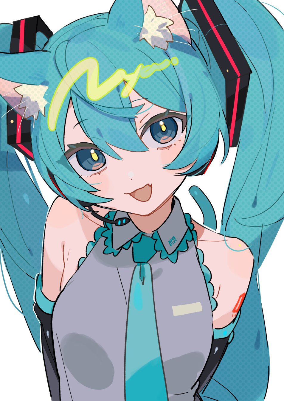 1girl animal_ear_fluff animal_ears aqua_eyes aqua_hair aqua_necktie aqua_trim arms_at_sides bare_shoulders breasts cat_ears cat_tail collarbone collared_shirt contrapposto detached_sleeves dithering fang grey_shirt hair_between_eyes hassan_(sink916) hatsune_miku head_tilt headset highres kemonomimi_mode lace lace-trimmed_collar lace-trimmed_shirt lace_trim looking_at_viewer microphone necktie open_mouth shirt simple_background skin_fang sleeveless sleeveless_shirt smile solo tail twintails upper_body vocaloid white_background yellow_pupils
