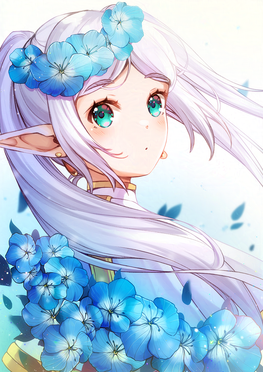 1girl capelet earrings elf floating_earrings flower frieren green_eyes grey_hair head_wreath highres jewelry mia_mikhail nemophila_(flower) pointy_ears solo sousou_no_frieren twintails white_capelet