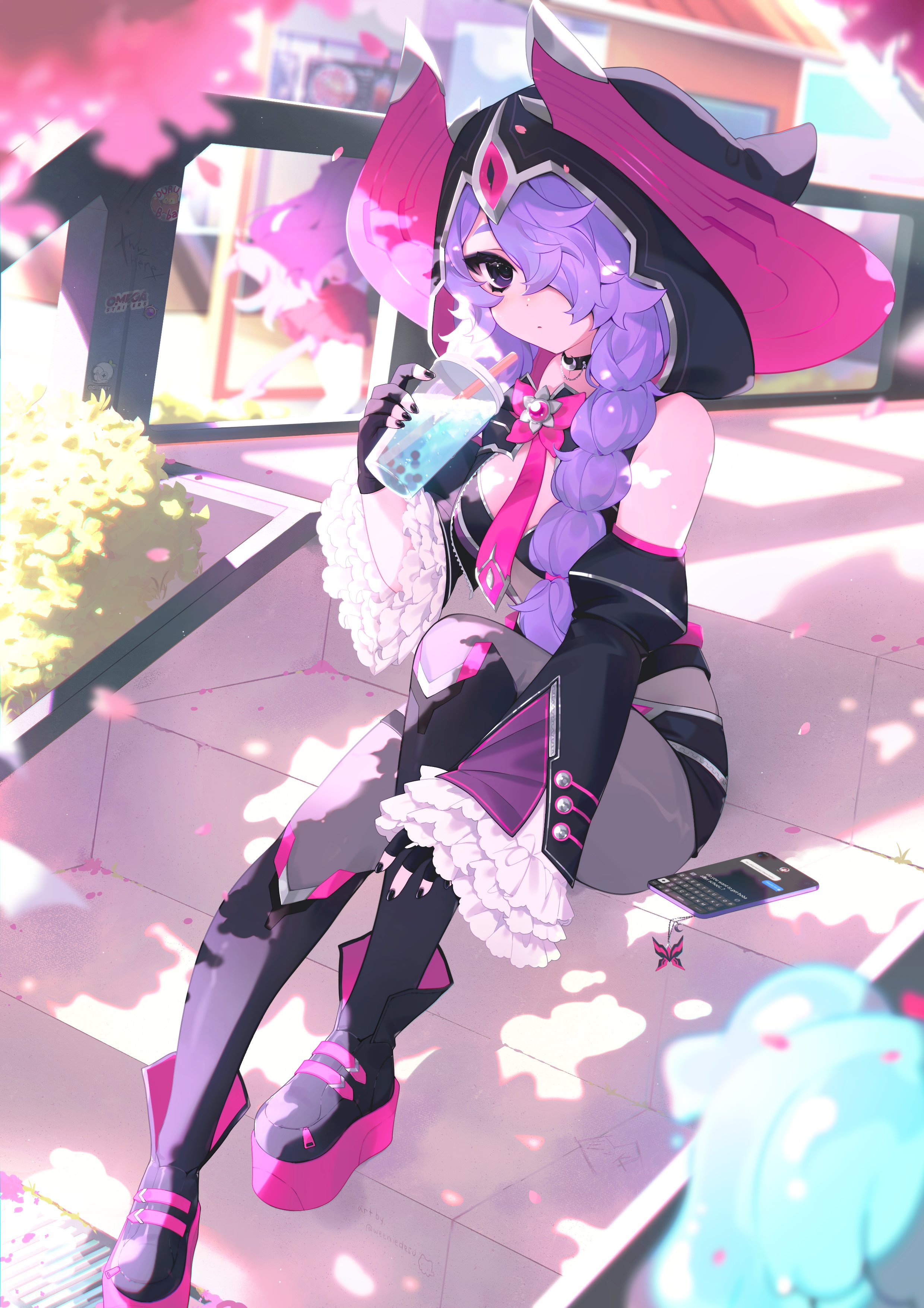 1girl absurdres black_choker black_dress black_eyes black_footwear black_gloves black_nails black_pantyhose breasts bug butterfly cape charm_(object) choker city collar cup dress drink era_(omega_strikers) eyebrows_hidden_by_hair gem gloves goth_fashion hat highres holding holding_cup holding_drink hood hooded_cape insect long_sleeves looking_to_the_side madi_(weeniedesu) medium_breasts necktie omega_strikers pantyhose phone pink_necktie pink_ribbon purple_hair ribbon sitting sitting_on_stairs sleeves_past_wrists solo stairs sunlight witch witch_hat