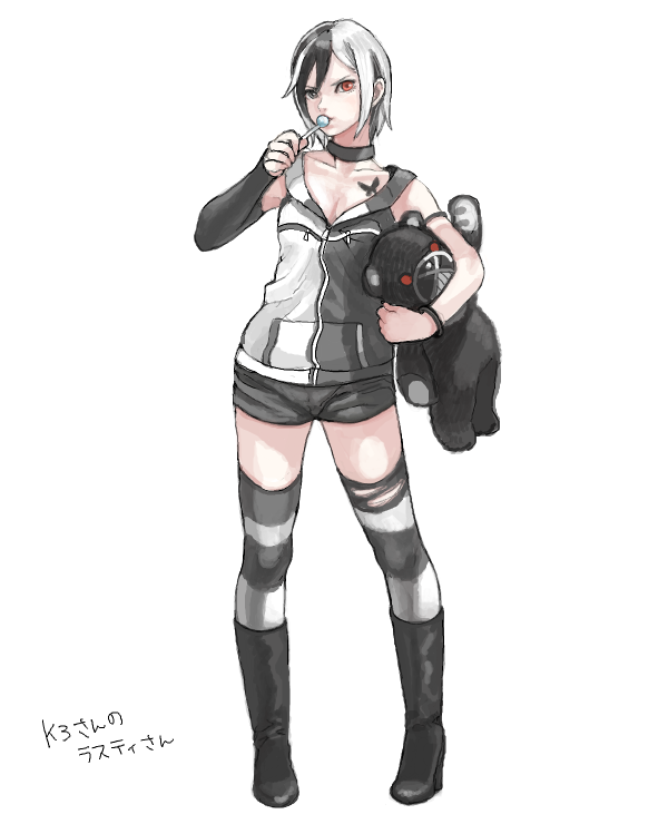 1girl arm_warmers black_boots black_hair black_shorts boots breasts butterfly_tattoo candy character_request chest_tattoo collarbone copyright_request food frown full_body grey_eyes grey_thighhighs gufu_(guffuumu) heterochromia holding holding_candy holding_food holding_lollipop holding_stuffed_toy lollipop multicolored_hair multicolored_thighhighs orange_eyes shirt short_hair short_shorts shorts sidelocks simple_background single_arm_warmer sleeveless sleeveless_shirt small_breasts solo standing stuffed_animal stuffed_toy tachi-e tattoo teddy_bear thighhighs thighs two-tone_hair two-tone_shirt two-tone_thighhighs white_background white_hair white_thighhighs zipper zipper_pull_tab