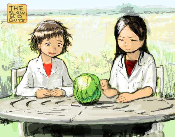 2girls arms_on_table bad_drawr_id bad_id black_hair breast_pocket brown_eyes brown_hair chair closed_eyes closed_mouth field food fruit horizon johnnyama lab_coat logo long_hair long_sleeves multiple_girls oekaki open_mouth original outdoors parody parted_bangs pocket red_shirt shirt short_hair sitting sketch sky table the_slow_mo_guys watermelon
