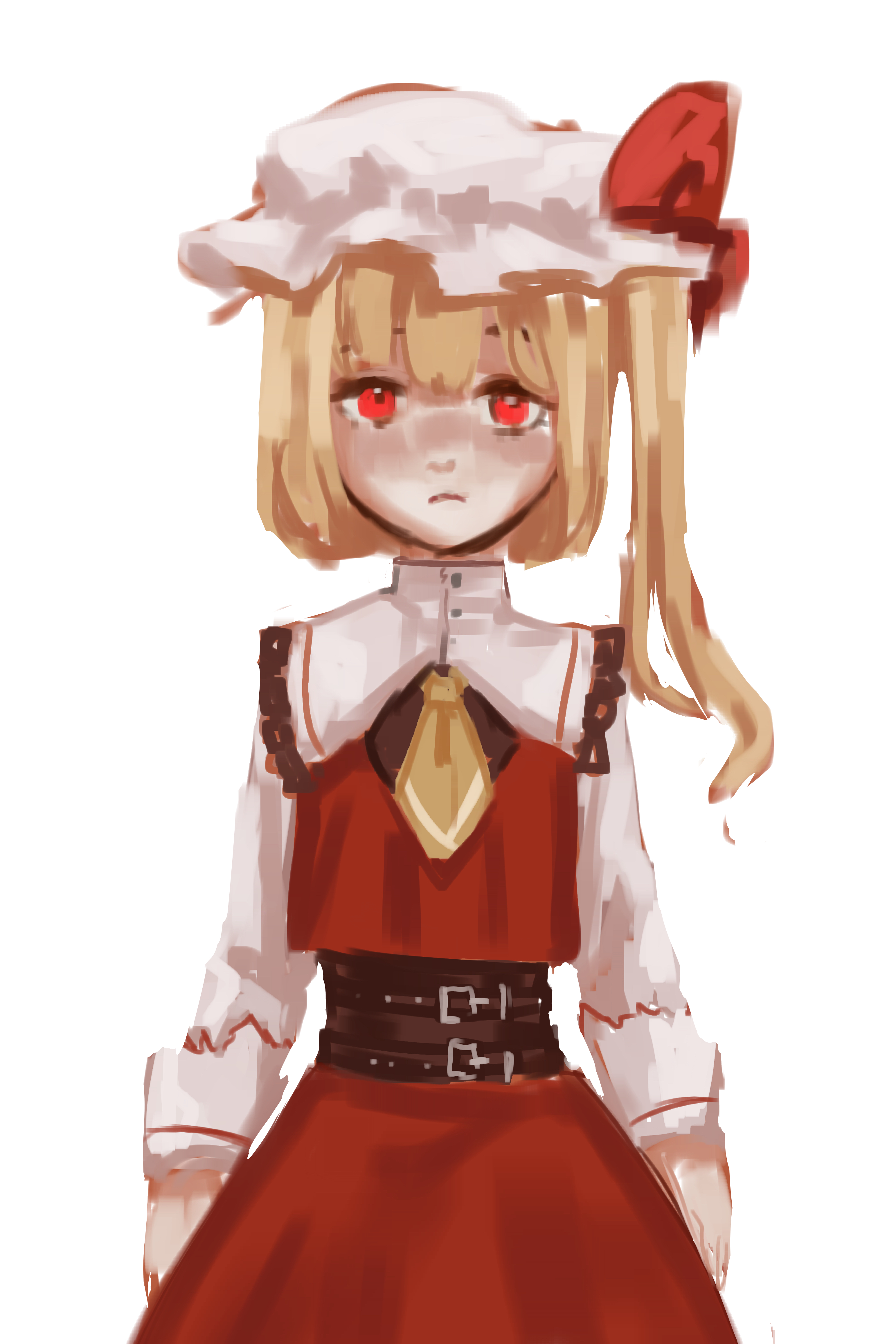 1girl absurdres adapted_costume ascot blonde_hair closed_mouth collared_shirt cowboy_shot crystal flandre_scarlet frilled_shirt_collar frills full_of_energy hat highres jewelry long_hair long_sleeves looking_at_viewer making-of mob_cap multicolored_wings one_side_up red_eyes red_skirt red_vest ring shirt simple_background skirt skirt_set solo touhou unfinished vest white_background white_hat white_shirt wings yellow_ascot