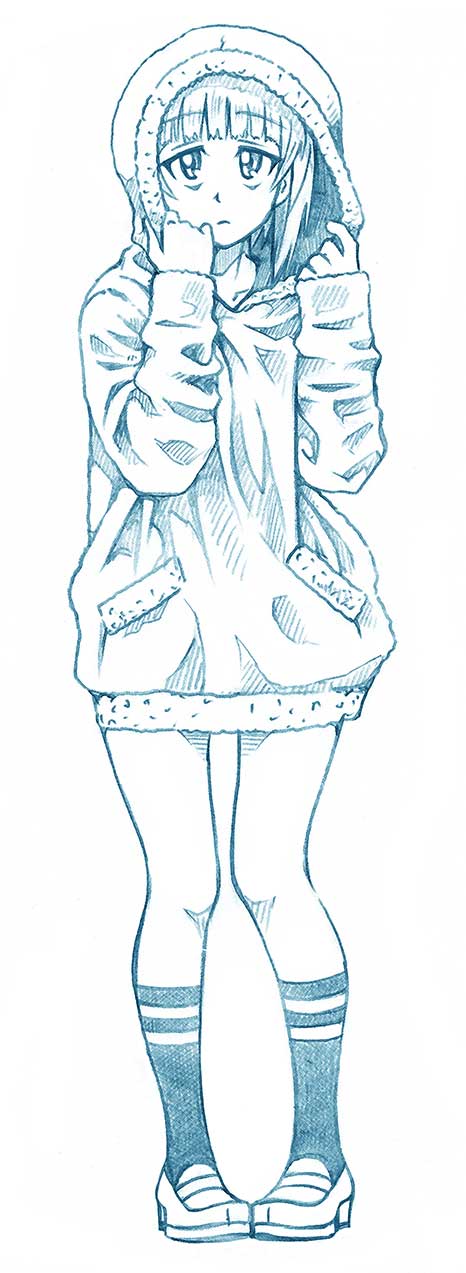 1girl adjusting_hood bbb_(friskuser) blue_theme blunt_bangs bob_cut casual closed_mouth commentary cutlass_(girls_und_panzer) double_horizontal_stripe frown full_body girls_und_panzer highres hood hood_up kneehighs loafers long_hoodie long_sleeves looking_at_viewer monochrome shoes short_hair socks solo standing
